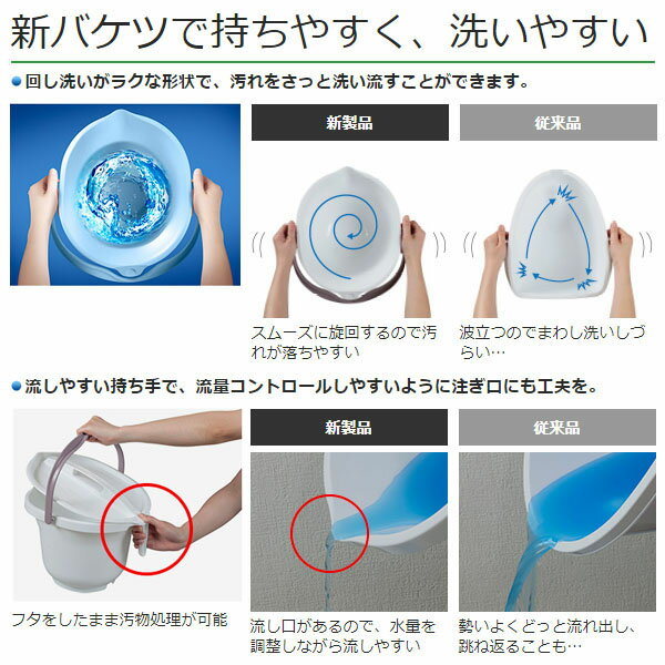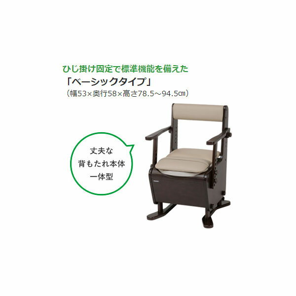 ●サイズ/幅53×奥行58×高さ78.5〜94.5cm、座面:幅39×奥行41cm、穴部:幅前12.5・後17.5×奥行32cm、便座高:37〜53cm(9段階/2cm)、ひじ掛け内寸:42cm、ひじ掛け高:14〜26cm(5段階/3cm) ●重さ/18.5kg ●材質/天然木、合成皮革、ポリプロピレン ●最大使用者体重/100kg ●生産国/ベトナム ●付属品/便座カバー、消臭液 ●標準機能/便座高さ調整、ひじ掛け高さ調整、ひじ掛けはね上げ、キャスター付、ペーパーホルダー付 ●完成品 ・ひじ掛け固定で丈夫な背もたれ本体一体型の「ベーシックタイプ」 ・前後に3cm長い長穴便座で前後から手を入れやすく拭き取りやすい。前方には尿こぼれしにくい尿漏れガード付き。 ・新バケツは回し洗いがラクな形状で、汚れをさっと洗い流すことができます。 ・その他、後方介助のための開閉機能や座面前後傾設定など使いやすさ・介助しやすさにこだわった豊富な機能満載です。 ・座るとセンサーが感知しすぐに脱臭。使用後自動で切れるタイマー付。 ※脱臭機能には電源が必要です。