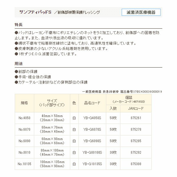 ●サイズ/8×10cm ●材質/パッド:レーヨン・合成繊維・ポリエチレン、粘着テープ:ポリエステル不織布・アクリル系粘着剤 ●医療機器番号/27B2X00038000019 ●生産国/日本 ・傷に固着しにくく血液や浸出液を素早く吸収する粘着パッド。 ・通気性に優れ、肌にやさしいアクリル系粘着剤を使用。 ・小児向けまでカバーした豊富なサイズ展開。 こちらもおすすめ サージカルテープ No.12(幅1.2cm) 24巻入 サージカルテープ No.25(幅2.5cm) 12巻入 サージカルテープ No.50(幅5cm) 6巻入 サンフティパッドS No.10135 10×13.5cm(30枚入) サンフティパッドS No.4050 4×5cm(50枚入) サンフティパッドS No.6070 6×7cm(50枚入) サンフティパッドS No.6090 6×9cm(50枚入) サンフティパッドS No.8010 8×10cm(30枚入)