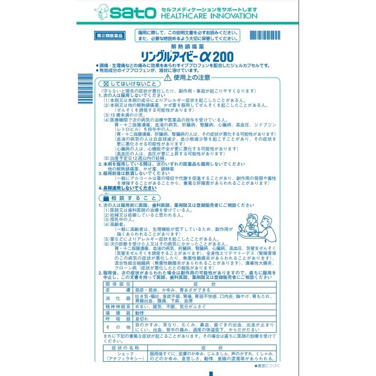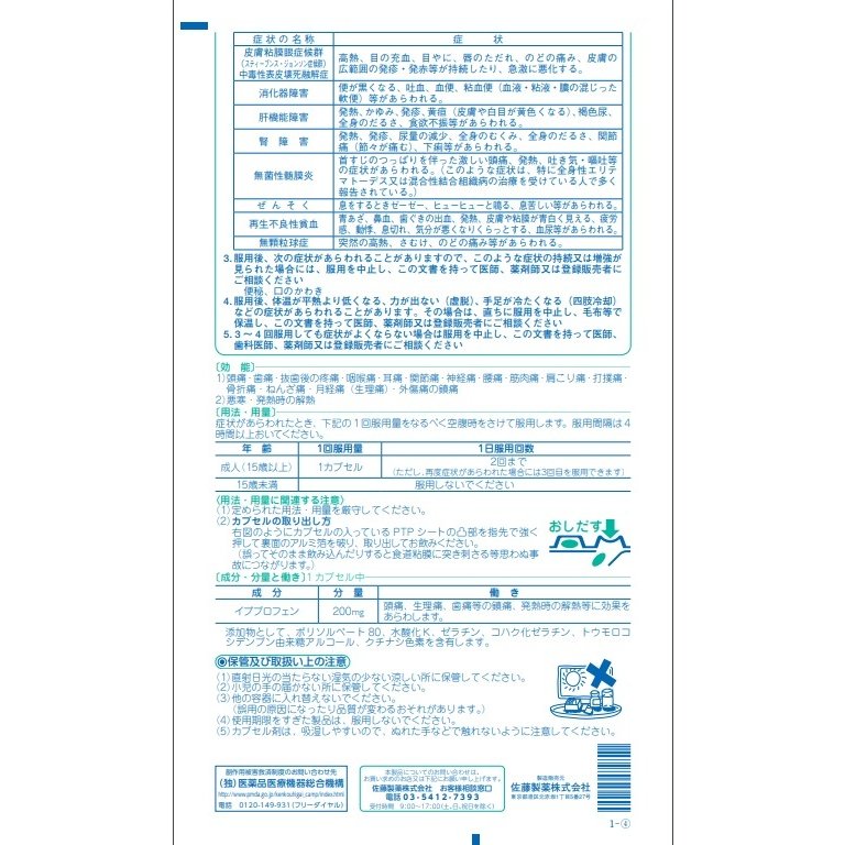 使用上の注意 ■してはいけないこと (守らないと現在の症状が悪化したり,副作用・事故が起こりやすくなります) 1.次の人は服用しないでください (1)本剤又は本剤の成分によりアレルギー症状を起こしたことがある人。 (2)本剤又は他の解熱鎮痛薬,かぜ薬を服用してぜんそくを起こしたことがある人。 (ぜんそくを誘発する可能性があります) (3)15歳未満の小児。 (4)医療機関で次の病気の治療や医薬品の投与を受けている人。 胃・十二指腸潰瘍,血液の病気,肝臓病,腎臓病,心臓病,高血圧,ジドブジン(レトロビル)を投与中の人。 (胃・十二指腸潰瘍,肝臓病,腎臓病の人は,その症状が悪化する可能性があります) (血液の病気の人は白血球減少,血小板減少等を起こすことがあり,その症状を更に悪化させる可能性があります) (心臓病の人は,心機能不全が更に悪化する可能性があります) (高血圧の人は,血圧が更に上昇する可能性があります) (5)出産予定日12週以内の妊婦。 2.本剤を服用している間は,次のいずれの医薬品も服用しないでください 他の解熱鎮痛薬,かぜ薬,鎮静薬 3.服用前後は飲酒しないでください (一般にアルコールは薬の吸収や代謝を促進することがあり,副作用の発現や毒性を増強することがあることから,重篤な肝障害があらわれることがあります) 4.長期連用しないでください ■相談すること 1.次の人は服用前に医師、歯科医師,薬剤師又は登録販売者にご相談ください (1)医師又は歯科医師の治療を受けている人。 (2)妊婦又は妊娠していると思われる人。 (3)授乳中の人。 (4)高齢者。 (一般に高齢者は,生理機能が低下しているため,副作用が強くあらわれることがあります) (5)薬などによりアレルギー症状を起こしたことがある人。 (6)次の診断を受けた人又はその病気にかかったことがある人。 胃・十二指腸潰瘍,血液の病気,肝臓病,腎臓病,心臓病,高血圧,気管支ぜんそく(気管支ぜんそくを誘発することがあります),全身性エリテマトーデス(腎障害等のこの病気の症状が悪化したり,無菌性髄膜炎があらわれることがあります),混合性結合組織病(無菌性髄膜炎があらわれることがあります),潰瘍性大腸炎,クローン病(症状が悪化したとの報告があります) 2.服用後,次の症状があらわれた場合は副作用の可能性がありますので,直ちに服用を中止し,この文書を持って医師,歯科医師,薬剤師又は登録販売者にご相談ください [関係部位:症状] 皮膚:発疹・発赤,かゆみ,青あざができる 消化器:吐き気・嘔吐,食欲不振,胃痛,胃部不快感,口内炎,胸やけ,胃もたれ,胃腸出血,腹痛,下痢,血便 精神神経系:めまい,眠気,不眠,気分がふさぐ 循環器:動悸 呼吸器:息切れ その他:目のかすみ,耳なり,むくみ,鼻血,歯ぐきの出血,出血が止まりにくい,出血,背中の痛み,過度の体温低下,からだがだるい まれに下記の重篤な症状が起こることがあります。その場合は直ちに医師の診療を受けてください。 [症状の名称:症状] ショック(アナフィラキシー):服用後すぐに,皮膚のかゆみ,じんましん,声のかすれ,くしゃみ,のどのかゆみ,息苦しさ,動悸,意識の混濁等があらわれる。 皮膚粘膜眼症候群(スティーブンス・ジョンソン症候群)中毒性表皮壊死融解症:高熱,目の充血,目やに,唇のただれ,のどの痛み,皮膚の広範囲の発疹・発赤等が持続したり,急激に悪化する。 消化器障害:便が黒くなる,吐血,血便,粘血便(血液・粘液・膿の混じった軟便)等があらわれる。 肝機能障害:発熱,かゆみ,発疹,黄疸(皮膚や白目が黄色くなる),褐色尿,全身のだるさ,食欲不振等があらわれる。 腎障害:発熱,発疹,尿量の減少,全身のむくみ,全身のだるさ,関節痛(節々が痛む),下痢等があらわれる。 無菌性髄膜炎:首すじのつっぱりを伴った激しい頭痛,発熱,吐き気・嘔吐等の症状があらわれる。(このような症状は,特に全身性エリテマト−デス又は混合性結合組織病の治療を受けている人で多く報告されている。) ぜんそく:息をするときゼーゼー,ヒューヒューと鳴る,息苦しい等があらわれる。 再生不良性貧血:青あざ,鼻血,歯ぐきの出血,発熱,皮膚や粘膜が青白く見える,疲労感,動悸,息切れ,気分が悪くなりくらっとする,血尿等があらわれる。 無顆粒球症:突然の高熱,さむけ,のどの痛み等があらわれる。 3.服用後,次の症状があらわれることがありますので,このような症状の持続又は増強が見られた場合には,服用を中止し,この文書を持って医師,薬剤師又は登録販売者にご相談ください 便秘,口のかわき 4.服用後,体温が平熱より低くなる,力が出ない(虚脱),手足が冷たくなる(四肢冷却)などの症状があらわれることがあります。その場合は,直ちに服用を中止し,毛布等で保温し,この文書を持って医師,薬剤師又は登録販売者にご相談ください 5.3〜4回服用しても症状がよくならない場合は服用を中止し,この文書を持って医師,歯科医師,薬剤師又は登録販売者にご相談ください 効能・効果1)頭痛・歯痛・抜歯後の疼痛・咽喉痛・耳痛・関節痛・神経痛・腰痛・筋肉痛・肩こり痛・打撲痛・骨折痛・ねんざ痛・月経痛(生理痛)・外