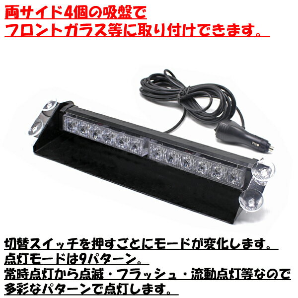 LED12灯搭載ライトバー。 拡散レンズにより効果的に点灯します。 12V-24V兼用タイプですので 乗用車・大型車・トレーラー・ボートなどの船舶等に幅広く対応します。 シガーソケットに接続するだけの簡単取り付けです。 操作もシガーソケット部の2種のスイッチによりシンプルに様々な 点灯モードでご使用いただけます。 切替スイッチを押すごとにモードが変化します。 点灯モードは9パターン。常時点灯から点滅・フラッシュ・流動点灯等なの多彩なパターンで点灯します。 警告灯、作業灯、緊急表示灯、防犯パトロール灯、道路誘導灯、等に最適です。 メモリー機能搭載により、電源を切っても再起動時に最後の点灯パターンから点灯しますので、 使用したい気に入った点灯パターンをスイッチ操作無く再び点灯使用が行えます。 コードの長さ約5mのロングタイプ。 従来品(約1m-3m)と比較し取り回しの良さがより向上しております。 内部基盤、コンデンサー等に放熱性の優れた部品を使用し、従来品より耐久性が向上しました。 ■本体サイズ(約):幅34.6cm×高さ5.5cm×奥行10cm ■本体重量(約):606g ■コードの長さ(約):5m ■定格電圧:DC12V/24V ■対応電圧:DC9-30V ■消費電流(平均):12V 0.5A/24V 0.3A ■定格消費電力:12W ■作動温度:-30℃〜+60℃ ■規格:非防水 ※防水設計ですが、車内設置用としての規格商品となりますので、完全防水(JIS規格等)を保証する仕様ではありません。 浸水事故、強い水圧が加わった場合等は内部へ浸水がある可能性あります。シガーソケット部は防水仕様ではありません。 ※取り付けは十分に注意して確実に行って下さい。当商品装着により生じた事故、損傷等の責任は一切負いかねます。 付属の吸盤のみでの取り付けは落下しますので行えません(吸盤を固定加工等行って下さい)。 ※本体へ強い振動や衝撃を与えると故障の原因となります。 ※点灯中は内部放熱により本体が熱くなりますのでご注意下さい。 【注意事項】 ★海外品により取り扱い説明書は付属はしておりません。 ★商品は新品未使用品ですが、パッケージが輸送や保管の関係上で多少キズ・汚れがある場合がありますのでご了承下さい。 ★商品の状況および返品・交換・保証については【お買い物ガイド】でご確認ください。 ★掲載商品につきましては、一部店頭在庫(実店舗)と共有している商品もございます。 「在庫有り」の表示があっても、ご注文後に欠品が発生する場合がございます。 完売や欠品の場合は、誠にご迷惑をお掛けいたしますが、予めご了承ください。 ※輸入品の為、予告なくデザイン,仕様などが変更される場合がございます。予めご了承ください。 ※モニターにより、色の見え方が実際の商品と異なる場合がございます。 ※こちらの商品は輸入品につき細かい傷がある場合がございますが、性能上は問題ございません。予めご了承ください。