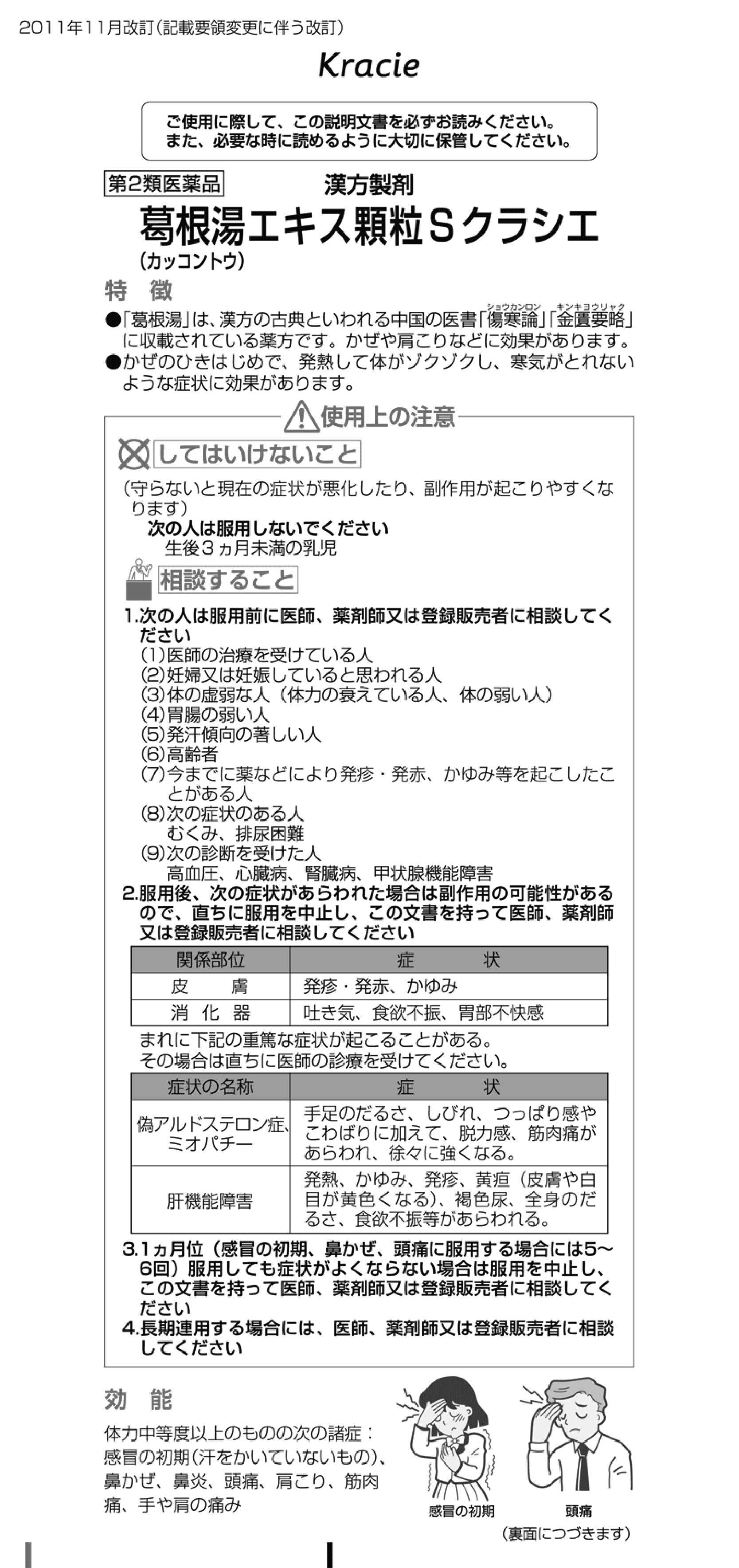 【楽天セール日を除き、15時までの注文の即日出荷を実施しております。15時以降の注文および、欠品商品の注文は当店からの出荷が翌日以降になる場合がございます。ご了承ください。】 【購入の前にお読みください】リニューアルに伴いパッケージ・容量等予告なく変更する場合がございます。予めご了承ください。医薬品ご購入の際は、商品画像欄にある添付文書をご確認ください。必ずご確認のうえ、用法・用量を守って正しくお使いください。特徴●「葛根湯」は、漢方の古典といわれる中国の医書「傷寒論」「金匱要略」に収載されている薬方です。かぜや肩こりなどに効果があります。●かぜのひきはじめで、発熱して体がゾクゾクし、寒気がとれないような症状に効果があります。効能・効果体力中等度以上のものの次の諸症:感冒の初期(汗をかいていないもの)、鼻かぜ、鼻炎、頭痛、肩こり、筋肉痛、手や肩の痛み表示成分または内容成分・成分量成人1日の服用量3包(1包1.5g)中、次の成分を含んでいます。成分・・・分量葛根湯エキス(3/4量)(カッコン6g、マオウ・タイソウ各3g、ケイヒ・シャクヤク各2.25g、カンゾウ1.5g、ショウキョウ0.75gより抽出。)・・・3900mg添加物として、ヒドロキシプロピルセルロース、乳糖、ポリオキシエチレンポリオキシプロピレングリコールを含有する。用法用量/使用方法<用法・用量>次の量を1日3回食前又は食間に水又は白湯にて服用。年齢・・・1回量・・・1日使用回数成人(15才以上)・・・1包・・・3回15才未満7才以上・・・2/3包・・・3回7才未満4才以上・・・1/2包・・・3回4才未満2才以上・・・1/3包・・・3回2才未満・・・1/4包・・・3回【購入に関する注意事項】●リニューアルに伴いパッケージ・容量等予告なく変更する場合がございます。予めご了承ください。●大量注文(同一商品を10個以上ご注文)の場合、通常の配送よりも お時間がかかります。予めご了承ください。●同一のお客様、または同一のお届け先への大量のご注文は、当社の判断によりご注文をキャンセルさせていただく場合がございます。あらかじめご了承ください。●商品の価格は、弊社ネット店独自の価格で販売させて頂いており、実店舗とは価格が異なる 場合がございますので予めご了承ください。また、通常品・セール品に関わらず、予告なく価格の 変更をさせていただく場合がございますので、併せてご了承ください。
