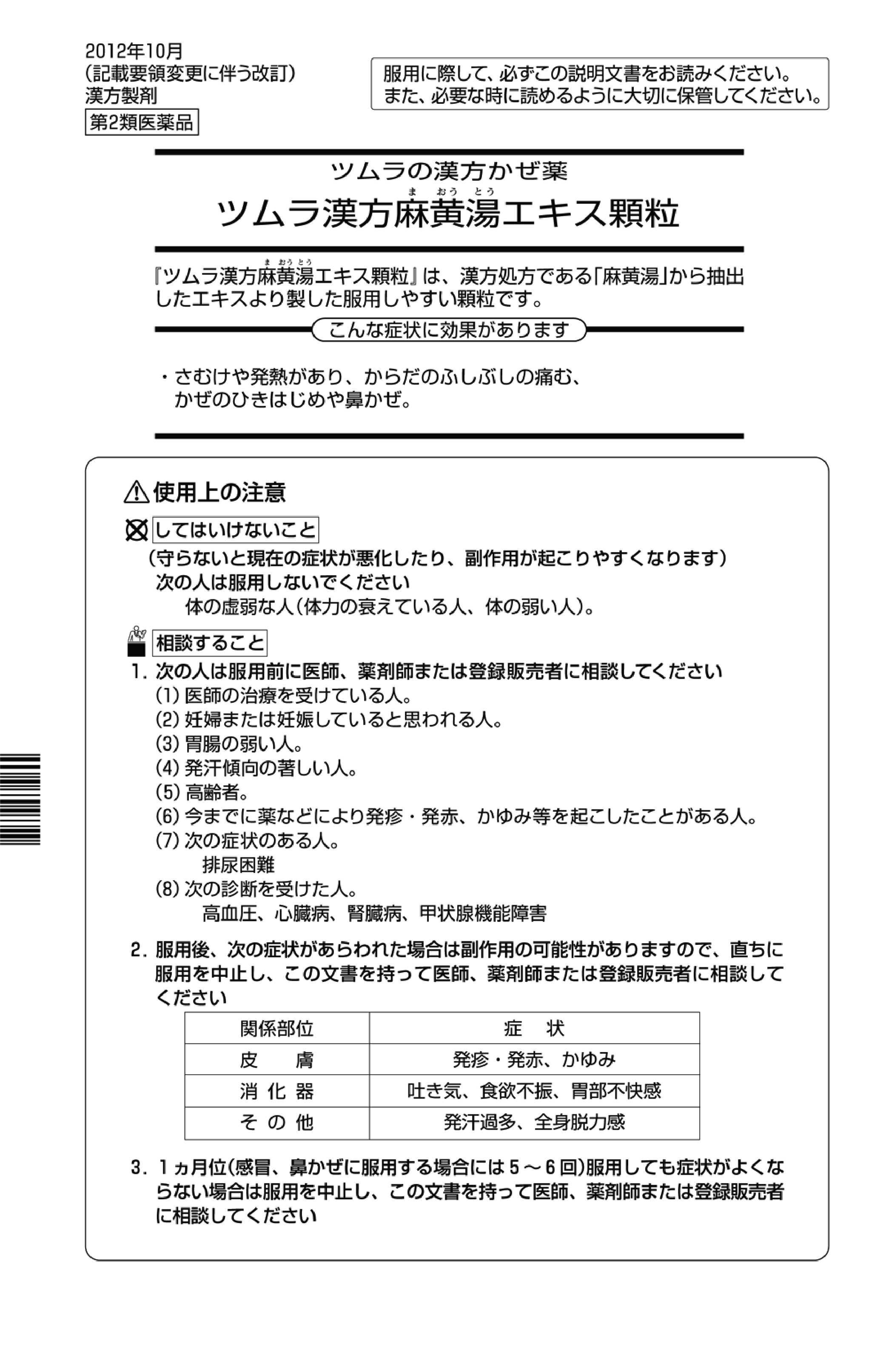 【楽天セール日を除き、15時までの注文の即日出荷を実施しております。15時以降の注文および、欠品商品の注文は当店からの出荷が翌日以降になる場合がございます。ご了承ください。】【購入の前にお読みください】リニューアルに伴いパッケージ・容量等予告なく変更する場合がございます。予めご了承ください。医薬品ご購入の際は、商品画像欄にある添付文書をご確認ください。必ずご確認のうえ、用法・用量を守って正しくお使いください。特徴『ツムラ漢方麻黄湯エキス顆粒』は、漢方処方である「麻黄湯」から抽出したエキスより製した服用しやすい顆粒です。[こんな症状に効果があります]・さむけや発熱があり、からだのふしぶしの痛む、かぜのひきはじめや鼻かぜ。効能・効果体力充実して、かぜのひきはじめで、さむけがして発熱、頭痛があり、せきが出て身体のふしぶしが痛く汗が出ていないものの次の諸症:感冒、鼻かぜ、気管支炎、鼻づまり表示成分または内容成分・成分量本品2包(3.75g)中、下記の割合の麻黄湯エキス(1/2量)0.875gを含有します。日局キョウニン・・・2.5g日局マオウ・・・2.5g日局ケイヒ・・・2.0g日局カンゾウ・・・0.75g添加物として日局軽質無水ケイ酸、日局ステアリン酸マグネシウム、日局乳糖水和物を含有します。用法用量/使用方法<用法・用量>次の量を、食前に水またはお湯で服用してください。成人(15歳以上)・・・1回量1包(1.875g)、1日服用回数2回7歳以上15歳未満・・・1回量2/3包、1日服用回数2回4歳以上7歳未満・・・1回量1/2包、1日服用回数2回2歳以上4歳未満・・・1回量1/3包、1日服用回数2回2歳未満・・・服用しないでください【購入に関する注意事項】●リニューアルに伴いパッケージ・容量等予告なく変更する場合がございます。予めご了承ください。●大量注文(同一商品を10個以上ご注文)の場合、通常の配送よりも お時間がかかります。予めご了承ください。●同一のお客様、または同一のお届け先への大量のご注文は、当社の判断によりご注文をキャンセルさせていただく場合がございます。あらかじめご了承ください。●商品の価格は、弊社ネット店独自の価格で販売させて頂いており、実店舗とは価格が異なる 場合がございますので予めご了承ください。また、通常品・セール品に関わらず、予告なく価格の 変更をさせていただく場合がございますので、併せてご了承ください。