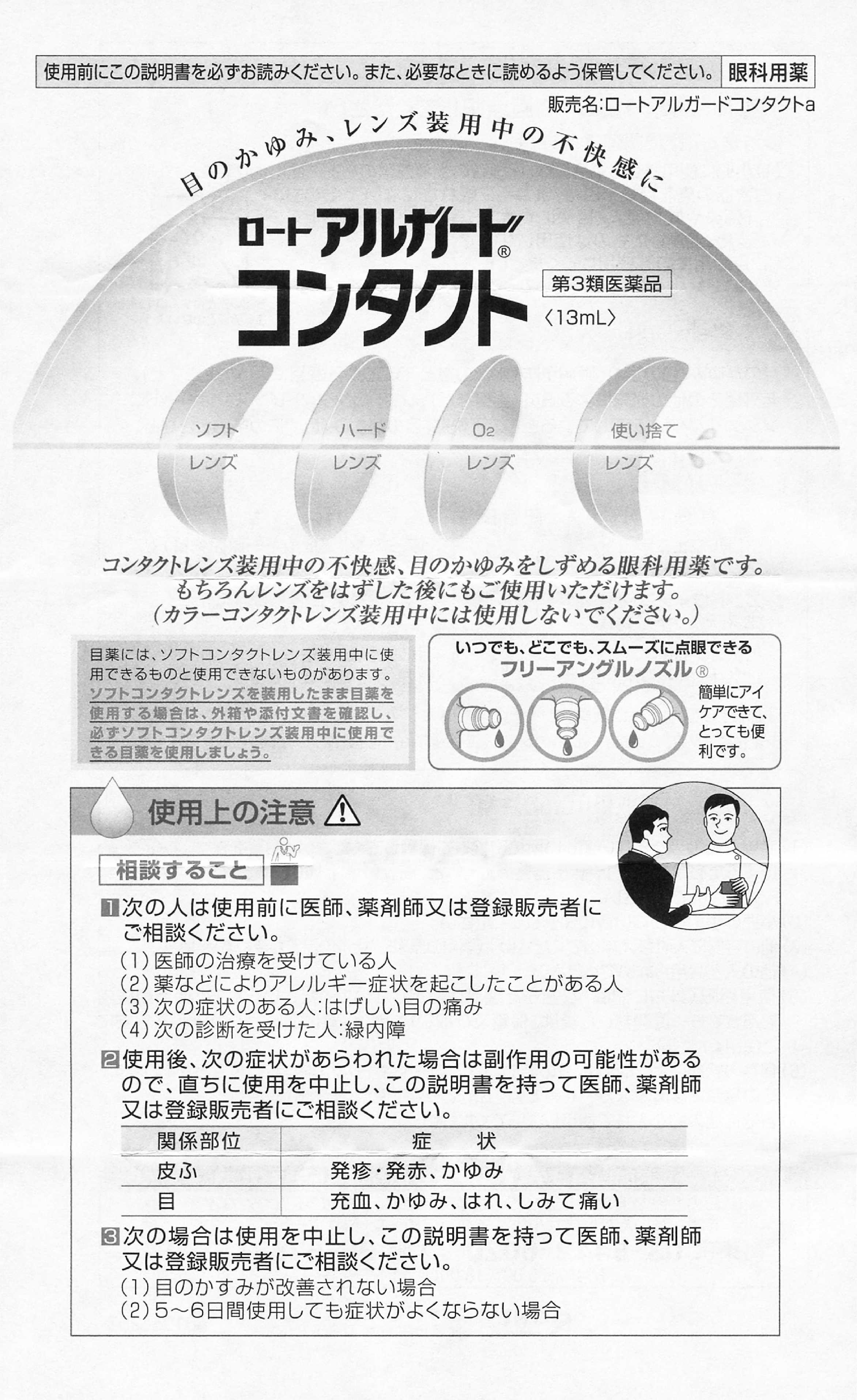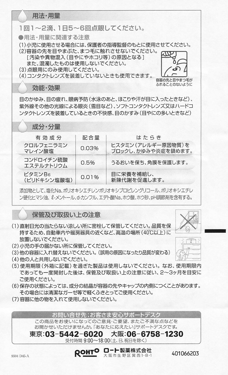【楽天セール日を除き、15時までの注文の即日出荷を実施しております。15時以降の注文および、欠品商品の注文は当店からの出荷が翌日以降になる場合がございます。ご了承ください。】 【購入の前にお読みください】リニューアルに伴いパッケージ・容量等予告なく変更する場合がございます。予めご了承ください。医薬品ご購入の際は、商品画像欄にある添付文書をご確認ください。必ずご確認のうえ、用法・用量を守って正しくお使いください。特徴コンタクトレンズ装用中の不快感、目のかゆみをしずめる眼科用薬です。もちろんレンズをはずした後にもご使用いただけます。(カラーコンタクトレンズ装用中には使用しないでください。)効能・効果目のかゆみ、目の疲れ、眼病予防(水泳のあと、ほこりや汗が目に入ったときなど)、紫外線その他の光線による眼炎(雪目など)、ソフトコンタクトレンズ又はハードコンタクトレンズを装着しているときの不快感、目のかすみ(目やにの多いときなど)表示成分または内容成分・成分量有効成分・・・分量・・・作用クロルフェニラミンマレイン酸塩・・・0.03%・・・ヒスタミン(アレルギー原因物質)をブロックし、かゆみや炎症を鎮めます。コンドロイチン硫酸エステルナトリウム・・・0.5%・・・うるおいを保ち、角膜を保護します。ビタミンB6(ピリドキシン塩酸塩)・・・0.01%・・・目に栄養を補給し、新陳代謝を促進します。添加物として、塩化Na、ポリオキシエチレンポリオキシプロピレングリコール、ポリオキシエチレン硬化ヒマシ油、l-メントール、d-カンフル、エデト酸Na、ホウ酸、ホウ砂、pH調節剤を含有する。用法用量/使用方法<用法・用量>1回1〜2滴、1日5〜6回点眼してください。【購入に関する注意事項】●リニューアルに伴いパッケージ・容量等予告なく変更する場合がございます。予めご了承ください。●大量注文(同一商品を10個以上ご注文)の場合、通常の配送よりも お時間がかかります。予めご了承ください。●同一のお客様、または同一のお届け先への大量のご注文は、当社の判断によりご注文をキャンセルさせていただく場合がございます。あらかじめご了承ください。●商品の価格は、弊社ネット店独自の価格で販売させて頂いており、実店舗とは価格が異なる 場合がございますので予めご了承ください。また、通常品・セール品に関わらず、予告なく価格の 変更をさせていただく場合がございますので、併せてご了承ください。