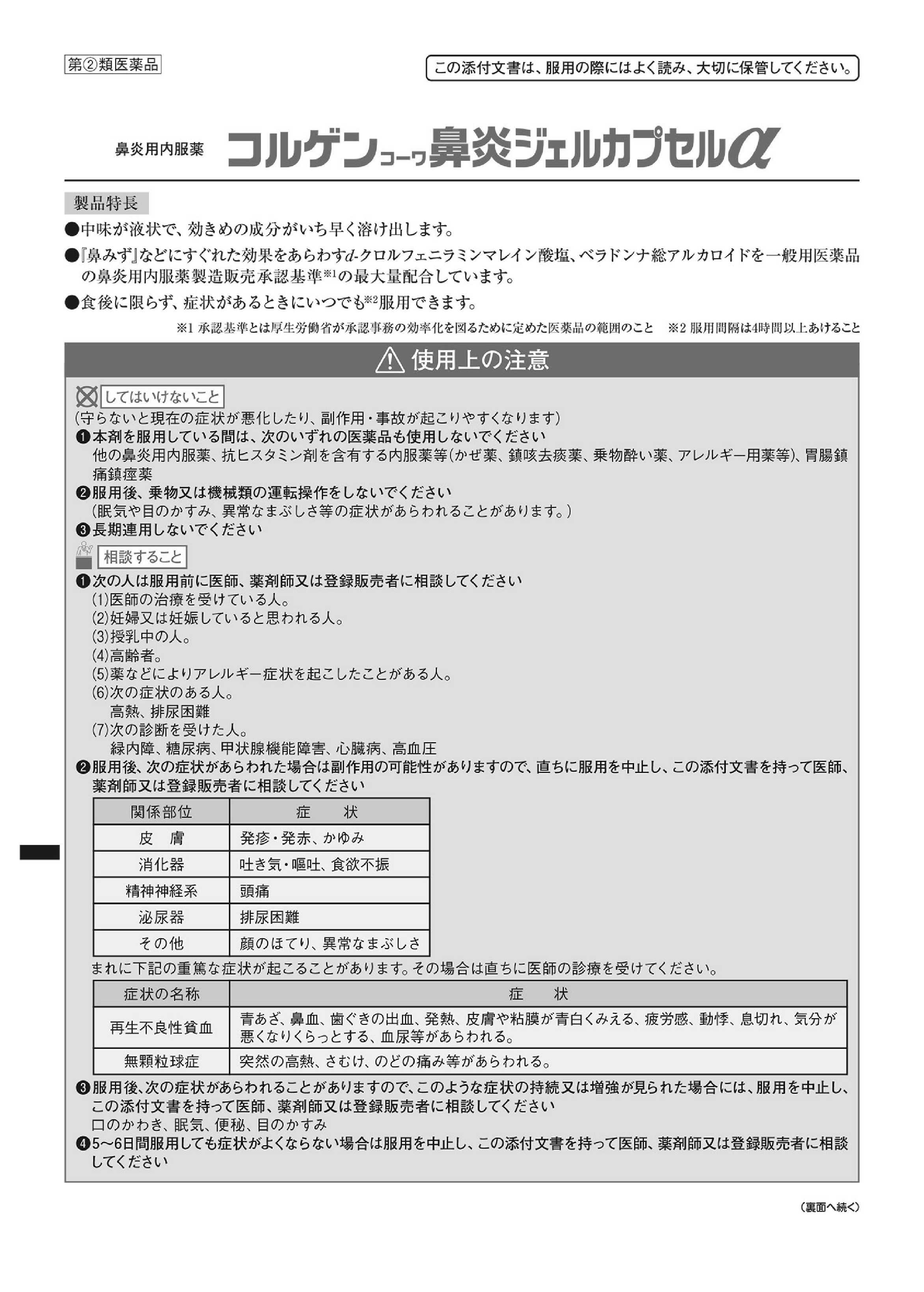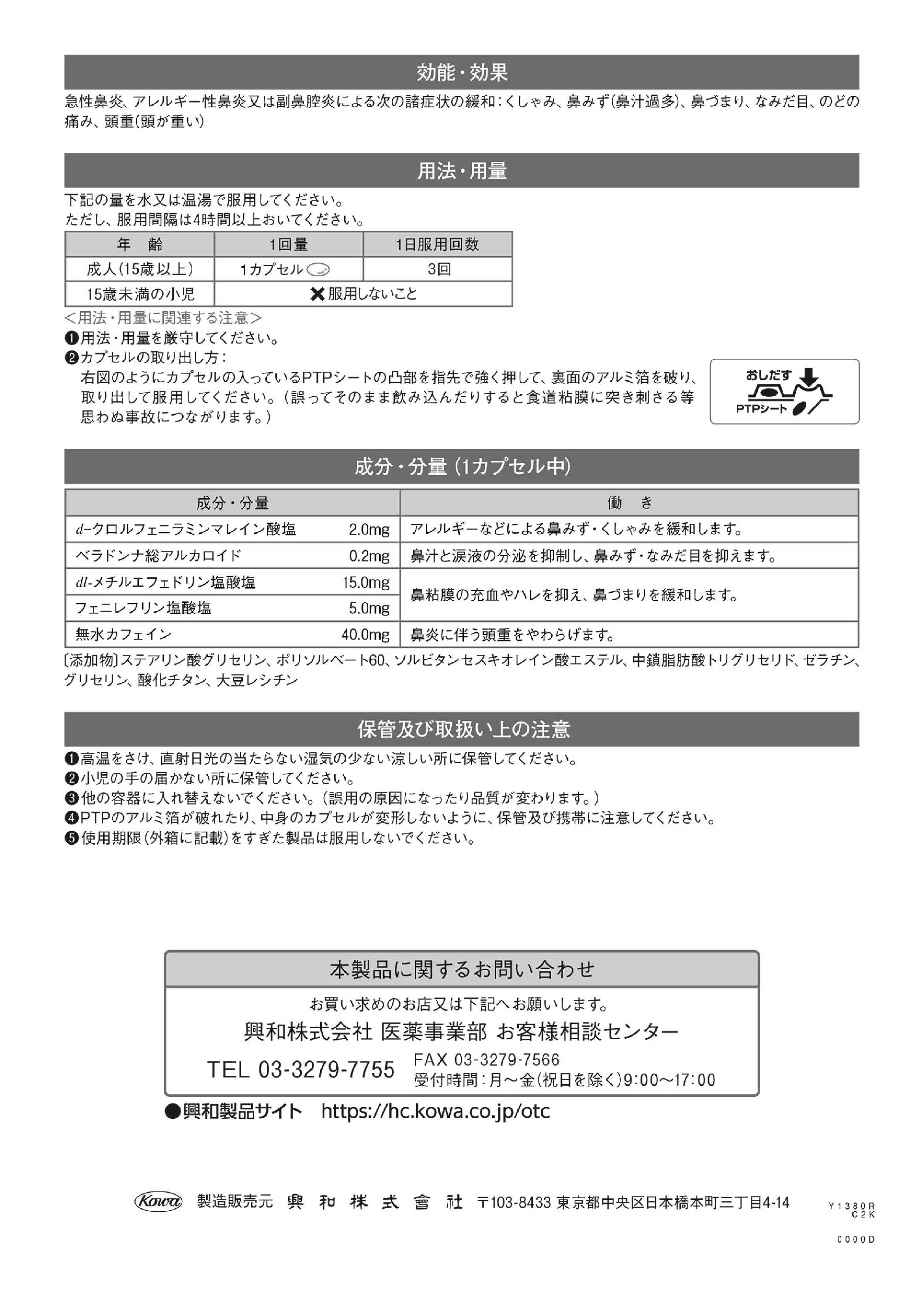 【楽天セール日を除き、15時までの注文の即日出荷を実施しております。15時以降の注文および、欠品商品の注文は当店からの出荷が翌日以降になる場合がございます。ご了承ください。】 【購入の前にお読みください】リニューアルに伴いパッケージ・容量等予告なく変更する場合がございます。予めご了承ください。医薬品ご購入の際は、商品画像欄にある添付文書をご確認ください。必ずご確認のうえ、用法・用量を守って正しくお使いください。特徴】鼻炎用内服薬●中味が液状で、効きめの成分がいち早く溶け出します。●『鼻みず』などにすぐれた効果をあらわすd-クロルフェニラミンマレイン酸塩、ベラドンナ総アルカロイドを一般用医薬品の鼻炎用内服薬製造販売承認基準※の最大量配合しています。※承認基準とは厚生労働省が承認事務の効率化を図るために定めた医薬品の範囲のこと●食後に限らず、症状があるときにいつでも*服用できます。*服用間隔は4時間以上あけること【効能・効果】急性鼻炎、アレルギー性鼻炎又は副鼻腔炎による次の諸症状の緩和:くしゃみ、鼻みず(鼻汁過多)、鼻づまり、なみだ目、のどの痛み、頭重(頭が重い)【内容成分・成分量】1カプセル中成分・・・分量・・・作用d-クロルフェニラミンマレイン酸塩・・・2.0mg・・・アレルギーなどによる鼻みず・くしゃみを改善します。ベラドンナ総アルカロイド・・・0.2mg・・・鼻汁と涙液の分泌を抑制し、鼻みず・なみだ目を抑えます。dl-メチルエフェドリン塩酸塩・・・15.0mg・・・鼻粘膜の充血やハレを抑え、鼻づまりを改善します。フェニレフリン塩酸塩・・・5.0mg・・・鼻粘膜の充血やハレを抑え、鼻づまりを改善します。無水カフェイン・・・40.0mg・・・鼻炎に伴う頭重をやわらげます。〔添加物〕ステアリン酸グリセリン、ポリソルベート60、ソルビタンセスキオレイン酸エステル、中鎖脂肪酸トリグリセリド、ゼラチン、グリセリン、酸化チタン、大豆レシチン【用法用量】<用法・用量>下記の量を水又は温湯で服用してください。ただし、服用間隔は4時間以上おいてください。年齢・・・1回量・・・1日服用回数成人(15歳以上)・・・1カプセル・・・3回15歳未満の小児・・・服用しない
