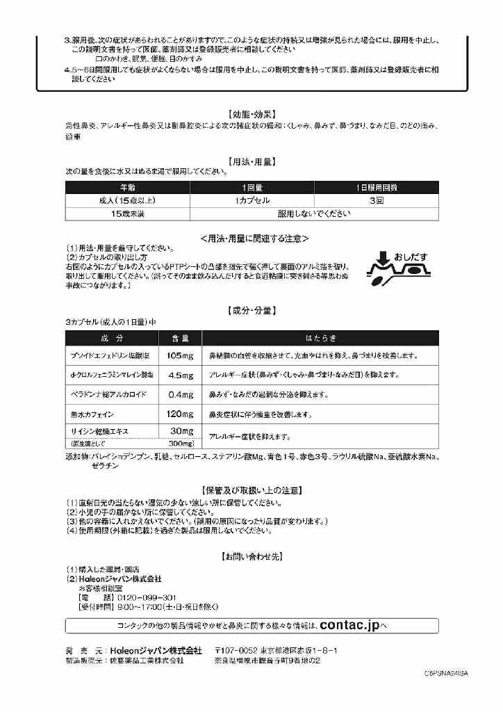 【楽天セール日を除き、15時までの注文の即日出荷を実施しております。15時以降の注文および、欠品商品の注文は当店からの出荷が翌日以降になる場合がございます。ご了承ください。】 【購入の前にお読みください】リニューアルに伴いパッケージ・容量等予告なく変更する場合がございます。予めご了承ください。鼻炎用薬花粉・ほこりによるアレルギー性鼻炎や、かぜによる急性鼻炎に。くしゃみ、鼻みず、鼻づまりにすぐれた効き目。●プソイドエフェドリン塩酸塩が鼻づまりを緩和します●d-クロルフェニラミンマレイン酸塩+ベラドンナ総アルカロイドのダブルアクションで鼻みずを抑えます●アレルギー症状を抑える、サイシン乾燥エキスを配合●6つの症状(くしゃみ、鼻みず、鼻づまり、なみだ目、頭重、のどの痛み)に効く、鼻炎治療薬です急性鼻炎、アレルギー性鼻炎又は副鼻腔炎による次の諸症状の緩和:くしゃみ、鼻みず、鼻づまり、なみだ目、のどの痛み、頭重3カプセル(成人の1日量)中成分・・・分量・・・作用プソイドエフェドリン塩酸塩・・・105mg・・・鼻粘膜の血管を収縮させて、充血やはれを抑え、鼻づまりを改善します。d-クロルフェニラミンマレイン酸塩・・・4.5mg・・・アレルギー症状(鼻みず・くしゃみ・鼻づまり・なみだ目)を抑えます。ベラドンナ総アルカロイド・・・0.4mg・・・鼻みず・なみだの過剰な分泌を抑えます。無水カフェイン・・・120mg・・・鼻炎症状に伴う頭重を改善します。サイシン乾燥エキス(原生薬として 300mg)・・・30mg・・・アレルギー症状を抑えます。添加物:バレイショデンプン、乳糖、セルロース、ステアリン酸Mg、青色1号、赤色3号、ラウリル硫酸Na、亜硫酸水素Na、ゼラチン<用法・用量>次の量を食後に水又はぬるま湯で服用してください。年齢・・・1回量・・・1日服用回数成人(15歳以上)・・・1カプセル・・・3回15歳未満・・・服用しない【購入に関する注意事項】●リニューアルに伴いパッケージ・容量等予告なく変更する場合がございます。予めご了承ください。●大量注文(同一商品を10個以上ご注文)の場合、通常の配送よりも お時間がかかります。予めご了承ください。●同一のお客様、または同一のお届け先への大量のご注文は、当社の判断によりご注文をキャンセルさせていただく場合がございます。あらかじめご了承ください。●商品の価格は、弊社ネット店独自の価格で販売させて頂いており、実店舗とは価格が異なる 場合がございますので予めご了承ください。また、通常品・セール品に関わらず、予告なく価格の 変更をさせていただく場合がございますので、併せてご了承ください。