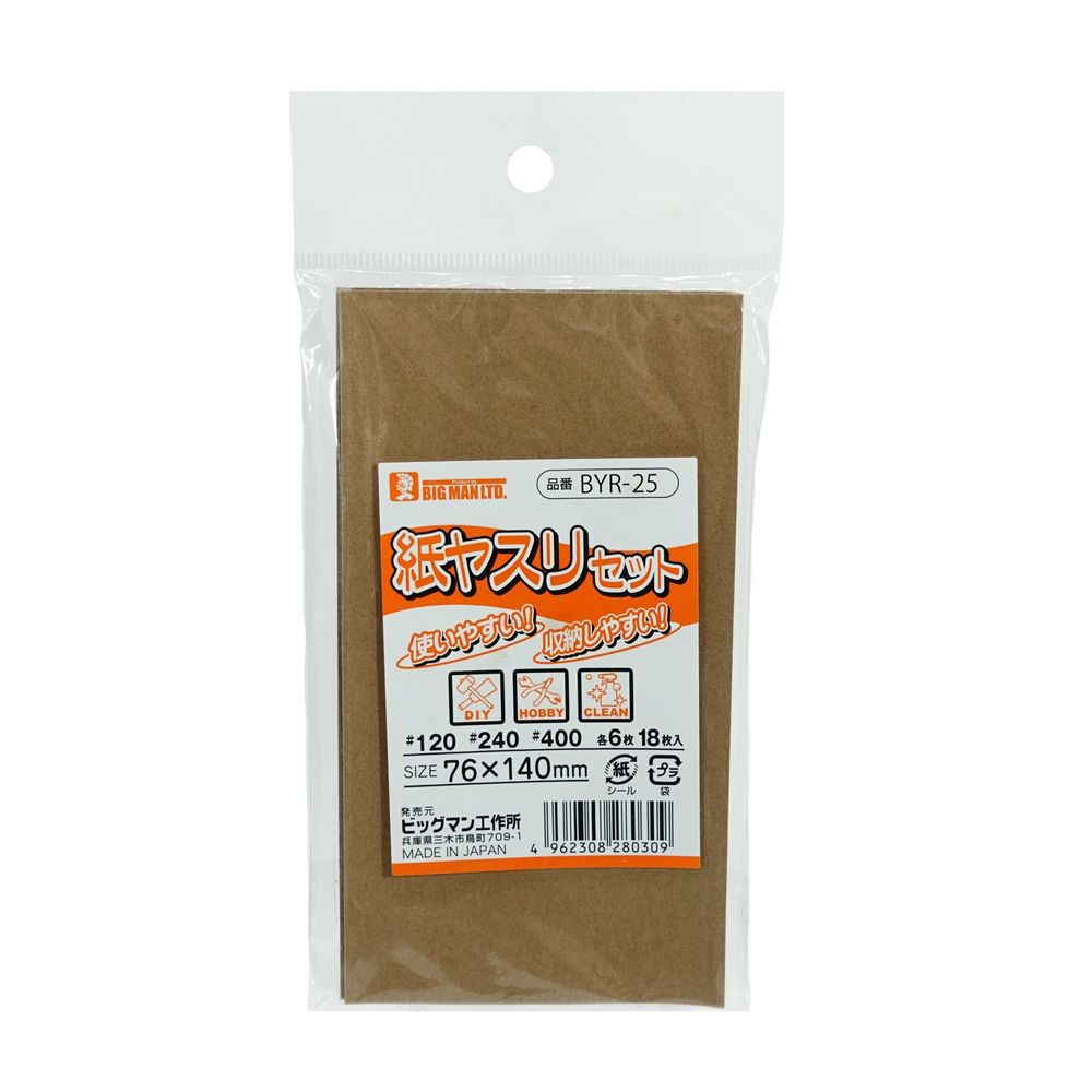 紙ヤスリ 18枚セット 紙やすり サンドペーパー セット BIGMAN ビッグマン 紙ヤスリミニセット #120 #240 #400 各6枚 BYR-25 コンパクト やすり ヤスリ 鑢 大工 DIY ハンドメイド 工作 プラモデル ホビー 汚れ落とし お掃除 日本製 4962308280309