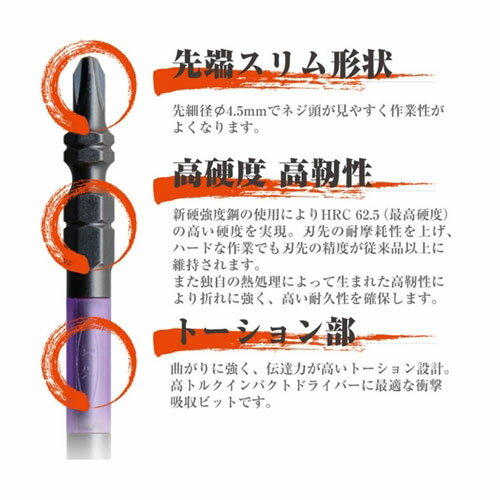 ■商品名 アネックス ANEX 黒龍靭ビット 5本組 ABRS5-01 先端工具 インパクトドライバー用 工具 DIY ドリル ■商品説明 ●『新硬強度鋼採用 驚異の耐久性』 ●高い硬度においても高いねばり強さを有し、摩耗にも折れにも強い新硬強度鋼。 ●鉄板にドリルビスを打ち込むような過酷な使用条件において最大のポテンシャルを発揮する。 ●曲がりに強く、伝達力が高いトーション設計、高トルクインパクトドライバーに最適な衝撃吸収ビット。 ●先端径4.5mmでネジ頭が見やすく作業性がよい。 ■商品詳細 ●セット内容:+2×65×1本、+2×85×2本、+2×110×2本 ●先端径:直径4.5mm ●硬度:HRC62.5 ●仕様:18Vインパクトドライバー対応