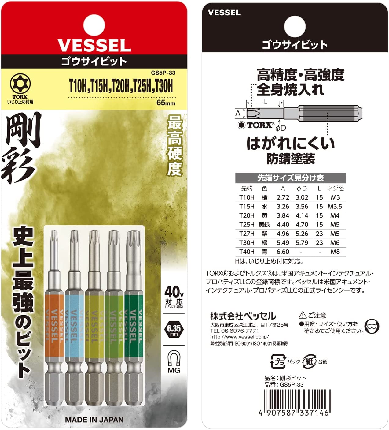 ベッセル VESSEL 40V対応 片頭トルクス 剛彩ビット 5本組 T10H T15H T20H T25H T30H×65 GS5P-33 65mm 建築 電気 機械組立 整備 精密組立 DIY 4907587337146