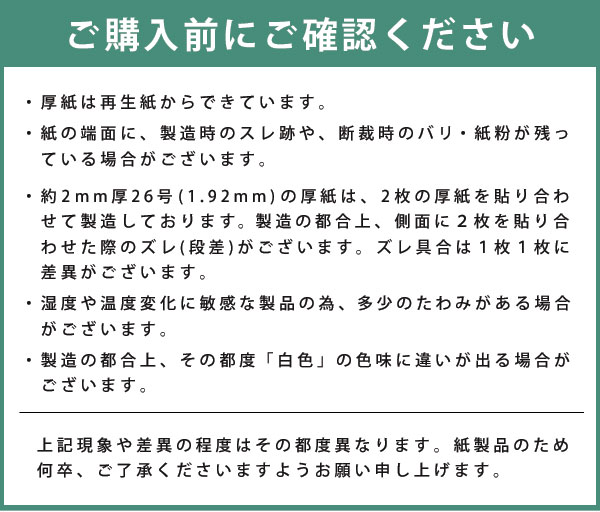 箱屋さんだからできる、厚紙セットです。 カルトナージュ・貼箱作り、製本や工作などにどうぞ 郵便の書類保護用にもお使い頂けます。 【サイズ】 550×400mm 【厚み】 約2mm厚 26号(1.92mm) 【カラー】 両面 白 【枚数】 5枚入り 【備考】 ・厚紙は再生紙からできています。 ・紙の端面に、製造時のスレ跡や、断裁時のバリ・紙粉が残っている場合がございます。 ・約2mm厚26号(1.92mm)の厚紙は、2枚の厚紙を貼り合わせて製造しております。 製造の都合上、側面に2枚を貼り合わせた際のズレ(段差)がございます。 ズレ具合は1枚1枚に差異がございます。 ・上記のとおり、貼り合わせのズレ具合により、商品サイズが約1mm前後する場合がございます。 ・湿度や温度変化に敏感な製品の為、多少のたわみがある場合がございます。 ・製造都合上、その都度「白色」の色味に違いが出る場合がございます。 ・緩衝材を使用して梱包致します。 【商品在庫について】 この商品は自社製品の製造にも使用しているため、 ご注文完了後にご注文商品が欠品する場合がございます。 あらかじめご了承くださいませ。 当店よりその場合「商品欠品のお知らせ」をお送りさせていただいております。 ご確認くださいますようお願いいたします。 【 配送について 】 こちらは、宅配便をご指定ください。 【他のサイズ厚みはこちらから】用途 箱屋さんだからできる、厚紙セットです。 カルトナージュ・貼箱作り、製本や工作などにどうぞ 郵便の書類保護用にもお使い頂けます。 商品詳細 品名 白 厚紙 約2mm厚 5枚セット 26号(1.92mm厚) サイズ 550×400mm 紙の厚み 約2mm厚 26号(1.92mm) セット枚数 5枚 カラー 両面 白 備考 ・厚紙は再生紙からできています。 ・紙の端面に、製造時のスレ跡や、断裁時のバリ・紙粉が残っている場合がございます。 ・約2mm厚26号(1.92mm)の厚紙は、2枚の厚紙を貼り合わせて製造しております。 製造の都合上、側面に2枚を貼り合わせた際のズレ(段差)がございます。 ズレ具合は1枚1枚に差異がございます。 ・上記のとおり、貼り合わせのズレ具合により、商品サイズが約1mm前後する場合がございます。 ・湿度や温度変化に敏感な製品の為、多少のたわみがある場合がございます。 ・製造都合上、その都度「白色」の色味に違いが出る場合がございます。 ・緩衝材を使用して梱包致します。 商品在庫について この商品は自社製品の製造にも使用しているため、 ご注文完了後にご注文商品が欠品する場合がございます。 あらかじめご了承くださいませ。 当店よりその場合「商品欠品のお知らせ」をお送りさせていただいております。 ご確認くださいますようお願いいたします。 配送について 宅配便 こちらの商品は【 宅配便 】をご指定ください。 メール便 サイズオーバーのため、メール便はご利用いただけません。 ※ご注文内容によっては、送料が変わる場合がございます。正確な金額は、 後程あらためてご案内させていただきます。 【その他の厚み・サイズ】 【箱屋さんが本職で使用している厚紙です】 厚紙 白 チップボール 26号 2mm 大判 5枚 貼り箱 貼箱 箱作り 2ミリ セット ちっぷぼーる カルトナージュ かるとなーじゅ 板紙 いたがみ 工作 こうさく 紙 かみ