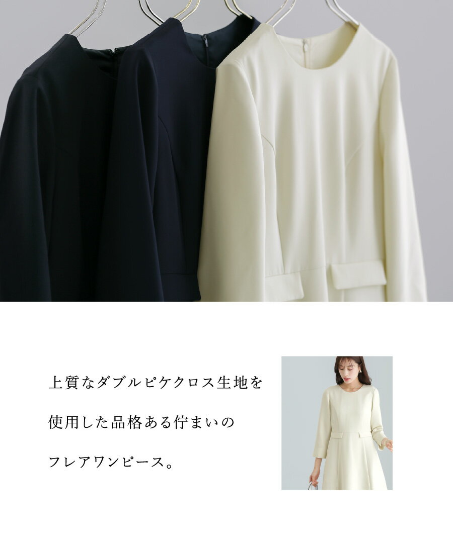 evidence メーカー希望小売価格はメーカー商品タグに基づいて掲載していますivory navy black detail 商品説明 UVカット・速乾・接触冷感・防シワ・ストレッチ・洗える 【多機能すぎるワンピース】 ダブルピケクロス・フレアワンピース ■ WHITE JOOLA ■ 「 一枚で完成形 好印象ワンピース 」 上質なダブルピケクロス生地を使用した 品のあるフレアワンピース。 一枚で着映える、頼れるきれいめワンピースです。 ハリ感のある生地でフレアラインを美しくキープ。 動くたびふわりと広がるシルエットが 上品な華やかさを添えます。 カラダのラインを美しく魅せる 切り替えデザインで立体的に。 さらにウエスト位置を高めに設定。 飾りフラップを施すことで目線を上にし スタイルアップを叶えます。 手元に軽やかさを添えるスリット入りの8分袖。 裏地付きで肌すべりが良く動きやすさも◎ バックはファスナー&ホック留め仕様です。 スラッシュポケット付き。 オフィススタイルはもちろんセレモニーにも◎ どんなシーンでも“好印象”を演出します。 同素材のパールジャケットと合わせて セットアップでの着用もおすすめです。 〈〈 ダブルピケ シリーズ 〉〉 ぷりっとしたハリのある中肉素材で 上質な印象を与える素材。 “ 嬉しい多機能素材 ” ●ホームケア… おうち洗いできるイージーケア ●ストレッチ … 2WAYストレッチ ●UVカット … 紫外線遮蔽率99%以上 ●クールタッチ … ひんやり感じる接触冷感 ●クイックドライ … 速乾性に優れ快適 ●防シワ … シワになりにくくお手入れラクチン 【 color 】 ●アイボリー[ 黄色がかったアイボリー ] ●ネイビー[ 深みのあるネイビー ] ●ブラック[ やわらかなブラック ] =================== 厚さ:★★★☆☆ 裏地:あり 透け感:なし 伸縮性:あり ケア:洗濯機可 シーズン:春・秋・冬 =================== 【 model 】 NOZOMI 167cm S着用 生地 ポリエステル94% ポリウレタン6% 裏地:ポリエステル100% 生産国 MADE IN CHINA(企画・検品は日本) 注意事項 ・室外の光や照明の当たり具合で、実際の色味と画像の色味に若干の違いが発生する場合がございます。 ・生産時期により、予告なくデザインの仕様やカラーの色味、素材が変更される場合がございます。 ・当商品は機械による生産の過程上、どうしても生地を織る際の糸の継ぎ目や多少のほつれ、他繊維の混紡、素材によるネップ・色ムラが生じる場合がございます。 ・同商品でも、形/サイズ/柄/生地感に多少の誤差が生じる場合がございます。 ・実寸サイズを測っているため多少の誤差が生じる場合がございます。 ・色落ち/色移りがある場合がございます。漂白剤は使用しないでください。 ・管理には万全を期してますが、姉妹店と在庫を共有しております為、ご注文のタイミングや、検品時の不良品の発覚等により商品をご用意出来ない場合がございます。