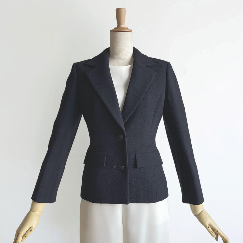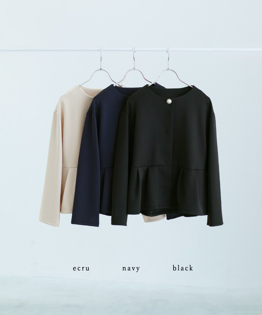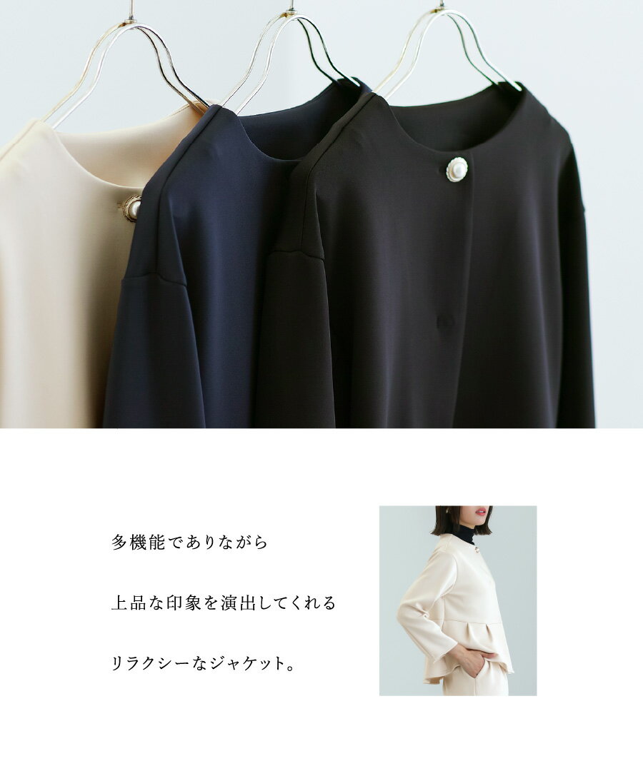 evidence メーカー希望小売価格はメーカー商品タグに基づいて掲載していますecru navy black detail 商品説明 無敵のジャケット 【洗える・UV CUT・ストレッチ・軽量・接触冷感】 ハイストレッチダンボールニット・デザインボタン付ノーカラージャケット ■ Emilyan ■ 「 一粒の輝きで 品よく華やぐ 」 ウエスト上で切り替えたラインに タックを施したノーカラージャケット。 裾にかけてほんのり広がるペプラムが 女性らしい立体感を演出します。 フロントには一粒だけあしらった 上品なデザインパール調ボタンが さりげないアクセントに。 その下にはくるみスナップボタンを配し フロントを開けて着たときにも 品よく見える仕立てに。 同素材のテーパードパンツと合わせれば きちんと感と軽やかさを両立した 洗練されたセットアップスタイルが完成。 〈〈 ダンボールニット シリーズ 〉〉 リラックスできる快適な着心地。 ほんのり光沢もあるため上品にみえる素材感。 “ 嬉しい多機能素材 ” ●ホームケア… おうち洗いできるイージーケア ●UVカット … 紫外線遮蔽率99%以上 ●ストレッチ…全方位ストレッチ ●軽量…軽やかな着心地でストレスフリー ●クールタッチ … ひんやり感じる接触冷感 ●マルチシーズン…晩夏から春まで着られる 【 color 】 ●エクリュ[ 淡くやわらかなエクリュベージュ ] ●ネイビー[ ほんのり青みがかった爽やかなネイビー ] ●ブラック[ 深みのあるブラック ] =================== 厚さ:★★☆☆☆ 透け感:なし 裏地:なし 伸縮性:あり ケア:手洗い可 シーズン:晩夏・秋・冬・春 =================== 【 model 】 NOZOMI 167cm S着用 RURU 167cm S着用 生地 ポリエステル87% ポリウレタン13% 生産国 MADE IN CHINA(企画・検品は日本) 注意事項 ・室外の光や照明の当たり具合で、実際の色味と画像の色味に若干の違いが発生する場合がございます。 ・生産時期により、予告なくデザインの仕様やカラーの色味、素材が変更される場合がございます。 ・当商品は機械による生産の過程上、どうしても生地を織る際の糸の継ぎ目や多少のほつれ、他繊維の混紡、素材によるネップ・色ムラが生じる場合がございます。 ・同商品でも、形/サイズ/柄/生地感に多少の誤差が生じる場合がございます。 ・実寸サイズを測っているため多少の誤差が生じる場合がございます。 ・色落ち/色移りがある場合がございます。漂白剤は使用しないでください。 ・管理には万全を期してますが、姉妹店と在庫を共有しております為、ご注文のタイミングや、検品時の不良品の発覚等により商品をご用意出来ない場合がございます。