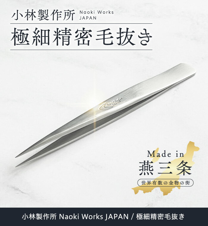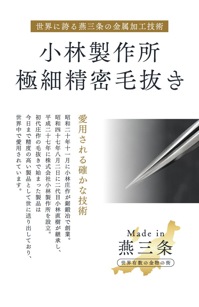 ピンセット専門の製造メーカーが作る至高の毛抜き 極細精密毛抜き キャップ付き [SUS304ステンレス] 先端部分のかみ合わせの精度が極めて高い、小林製作所の毛抜き。超極細の先端で、毛の密集部分でもピンポイントで狙って抜くことができます。全体的に細身のため、かきわけ時に視界を邪魔しません。 錆びにくく耐久性に優れた「SUS304ステンレス」を採用。使用後に先端を軽く拭き取り、付属のキャップで先端を保護することで、より長い間ご愛用いただけます。 販売名 極細精密毛抜き キャップ付き 商品区分 毛抜き(ツィザー) ブランド 小林製作所(Naoki Works) サイズ 約9×93mm 重量 約11g 材質 SUS304ステンレス 発売元 株式会社小林製作所 製造国 日本 販売者名 双葉貿易株式会社 広告文責 双葉貿易株式会社 TEL:0256-36-0072 #毛抜き #精密 #ピンセット #ツィザー #燕三条 #日本製 #高級 #角栓 #除去 #ピンポイント #小林製作所 #Naoki Works #ギフト #プレゼント #父の日 #母の日 ステンレス ツイザー ツイーザー 高級 けぬき 眉毛 鼻毛 ひげ うぶ毛 脱毛 痛くない メンズ レディース 女性 おすすめ ギフト プレゼント 国産 燕市 父の日 母の日 小林製作所 Naoki Works着後レビューを書いて必ず貰える!500円割引クーポン!詳しくはこちら 販売名 極細精密毛抜き キャップ付き 商品区分 毛抜き(ツィザー) シリーズ 小林製作所(Naoki Works) ブランド 小林製作所(Naoki Works) 型番 nws-mas サイズ 約9×93mm 重量 約11g 材質 SUS304ステンレス 発売元 株式会社小林製作所 製造国 日本 販売者名 双葉貿易株式会社 広告文責 双葉貿易株式会社 TEL:0256-36-0072 注意事項 ・ご使用の際は、刃先で皮膚をはさんだり、目などを傷付けないよう十分にご注意ください。 ・清潔なお肌にお使いください。 ・使用後は汚れを拭き取り、清潔に保管してください。 ・水洗いする場合は、水気や汚れを柔らかい布やティッシュなどで拭いてください。 ・小さなお子様の手の届かないところに保管してください。 昭和20年11月に小林庄作が鋸鍛冶で創業。昭和47年8月2日2代目小林直樹が継承し、平成27年株式会社小林製作所設立。初代庄作の毛抜きで始まった製品は今日まで精度の高い製品として世に送り出しており、ピンセットに関しては、特に使いやすく精度の高いまつ毛エクステ用や、ネイル、ホビー、盆栽、理化学等々の製品を国内、海外に向けて製造し愛用されています。今後、需要に合った様々な形状のピンセット(ツィザー)や毛抜き、骨抜き等をお届けし、世界に愛用される製品作りに励んでいきます。