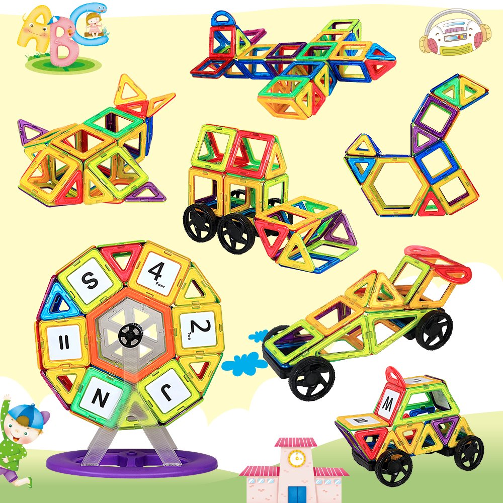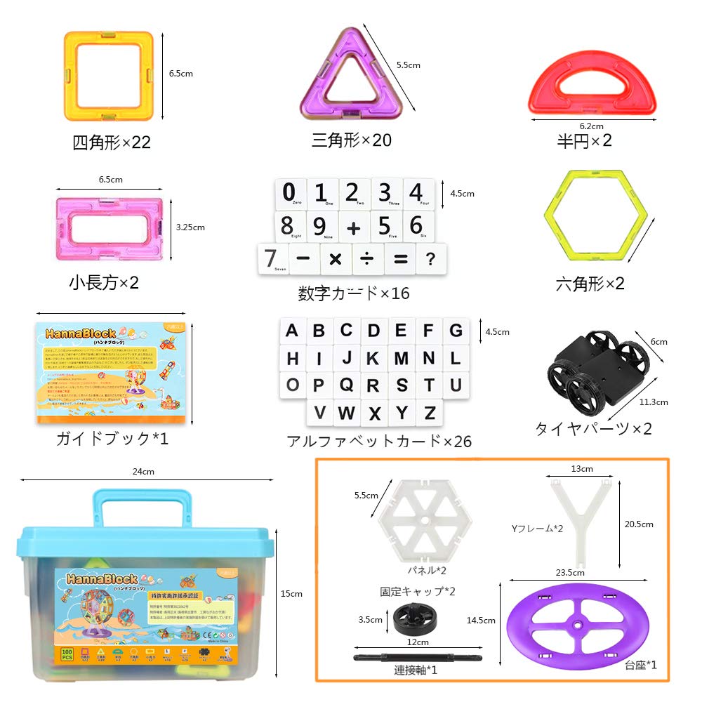 商品情報商品の説明主な仕様 ?【マグネットブロック 100PCSの内容物】:ブロック収納専用ケース×1個、正方形×24pcs、三角形×18pcs、小長方×4pcs、半円×2pcs、六角形×2pcs、車輪パーツ×2pcs、数字カード(非磁性)×16pcs、アルファベットカード(非磁性)×26pcs、観覧車パーツ×8個、専用ガイドブック(日本語)。br?【日本食品検査済・安全・安心・】:本商品は世界水準の日本食品検査をクリア(世界でも厳しいと言われる日本の食品安全基準)。また欧米の玩具認証EN-71、ASTMも認定済みマグネット おもちゃ! 肝心なブロックは高品質食品級のABS素材+天然磁石で作られており、プラスチック各辺の中央には強磁性のマグネットが内蔵されています。長時間経っても、磁力が弱くなりなく、有害物も発散しない知育おもちゃ マグネット ブロックです。br?【遊び方が無限大 ブロック知育玩具】:二次元の平面で作った展開図を、重心を持ち上げることで瞬時に3次元の立体に変形できますから、子供たちは平面(2D)と立体(3D)の関係を遊びながら覚えることができますし、自分の脳中の形を集中して作っていることで、創造性と想像力を鍛えるだけでなく、実践能力と論理的思想も開発できます。学習カードも付きで、計算の問題出しも楽しくなります。遊びと勉強が同時にできる磁気ブロックおもちゃです。(A・B・C、1・2・3などのカードは幼稚園幼児から遊べます。)br?【出産祝い・誕生日プレゼントなどに最適なマグネットおもちゃ 】:1歳と4歳と6歳年齢が違いますが、マグネットブロックならではのそれぞれ違った遊び方があります。さらに観覧車やタイヤパーツも付属しておりますので、サイコロから、くるま、観覧車ごっこまで、いつまでも長く遊ぶことができます。子供の教育・知育玩具として最高です。親子や友達同士も一緒に遊べます。お子様がきっと喜んで遊んでくれます。子供への入園・卒園ギフトまたはお誕生日プレゼント・出産祝いなどにピッタリ。児童館・保育園・幼稚園の立体遊び教具としてもオススメです。br?【商品保証が安心】:商品ご購入後1年間は、ご購入時の不具合、初期不良、ケース破損など、無料でご対応しております。 また、追加パーツや観覧車などの特殊パーツも取り揃えておりますので、安心してご購入いただけます。 何かございましたら、お気軽に販売元までご連絡くださいませ。