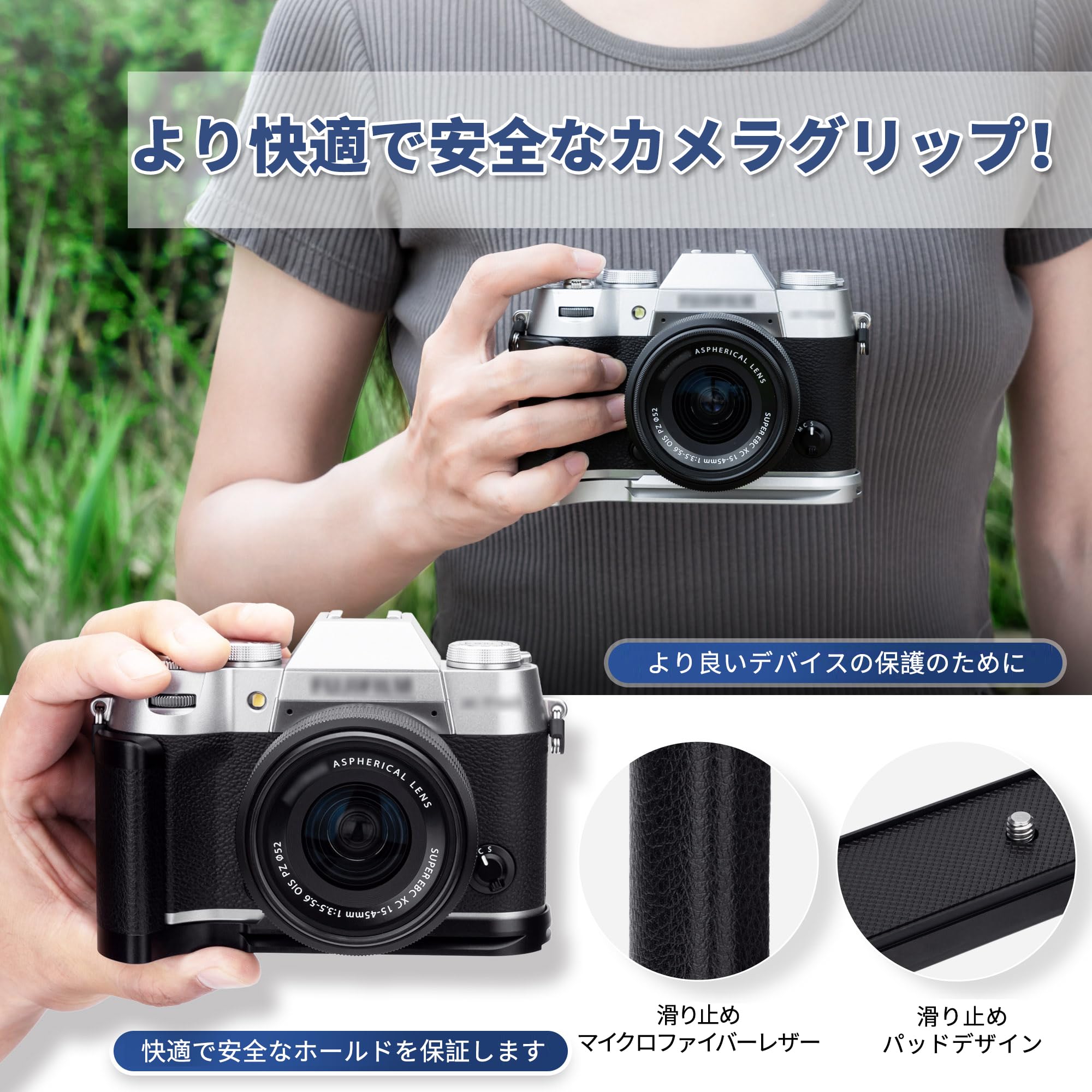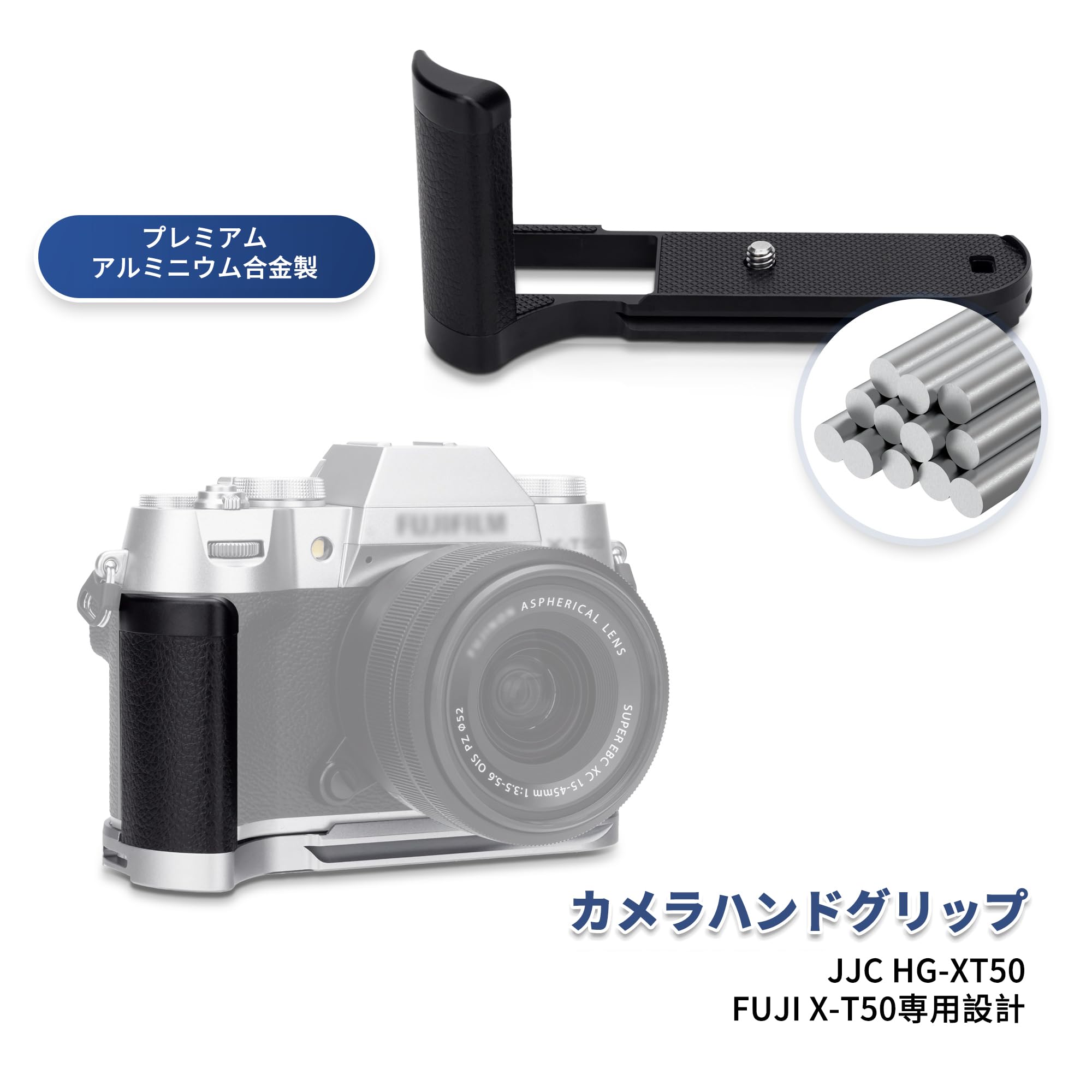 商品情報商品の説明主な仕様 X-T50 専用。br良質なアルミニウム合金製で、軽くて丈夫です。brグリップ部にはファイバーレザーを採用しホールド感を高めます。br装着する時に、バッテリーやメモリーカードを取り外しても大丈夫です。br底の1/4"-20のネジ穴を通じて、三脚や他の機材などを直接に取り付ける可能です。
