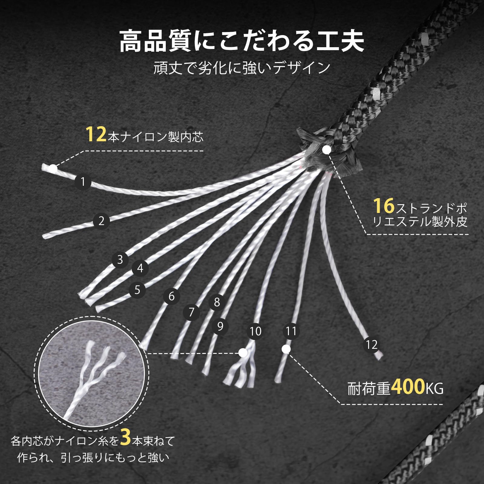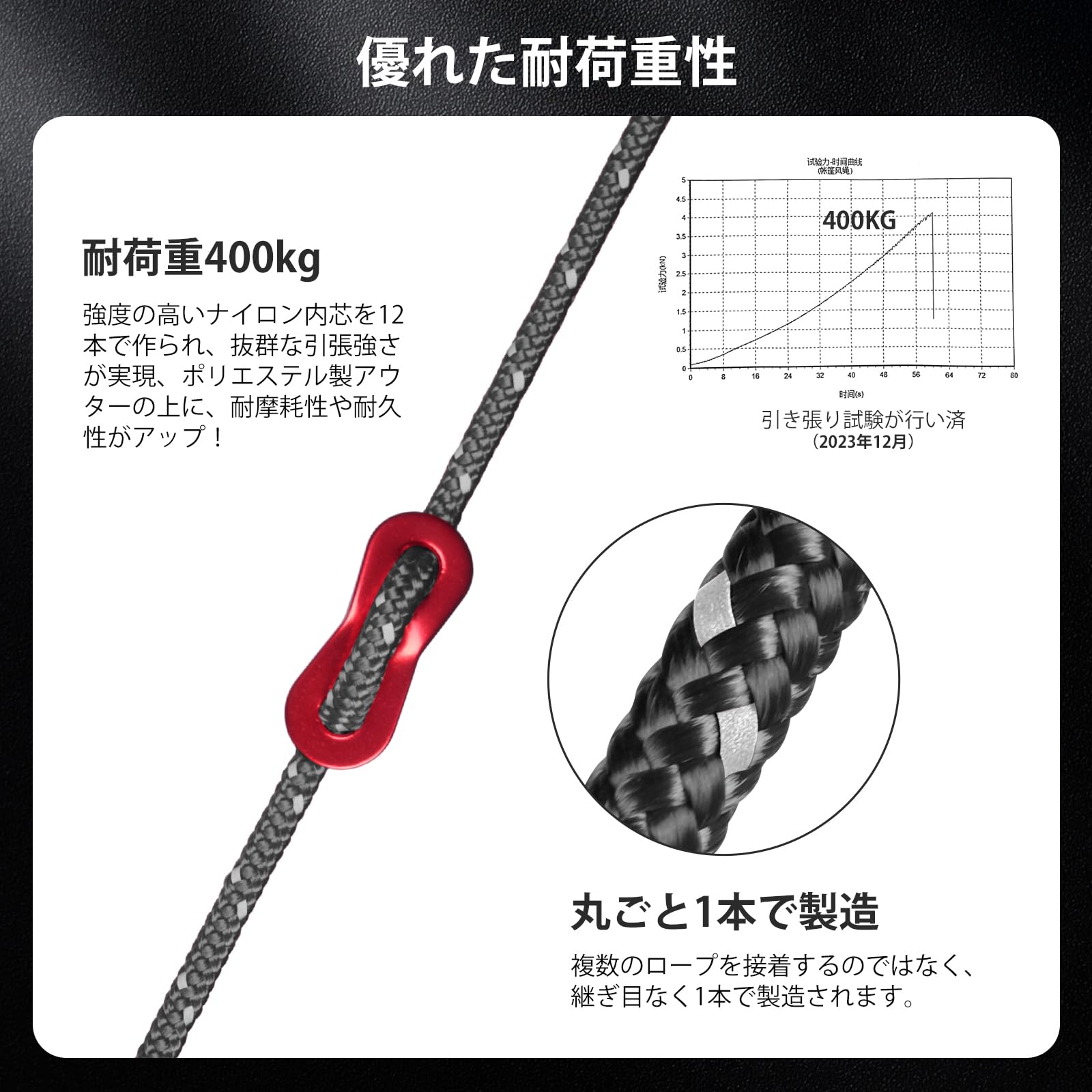 商品情報商品の説明主な仕様 【耐荷重400KG】DANOFYテント用パラコードはナイロン製内芯とポリエステル製外皮からなり、各内芯がナイロン糸を3本撚り合わせて合計12芯で作られた張りに強いガイロープです。アウターが16ストランドで緻密に編まれておるこのガイロープ 4mmは柔らかくて軽量でありながら、耐摩耗性と耐荷重性が大幅に向上しています。この頑丈な構造のおかげで、弊社のテントロープは最大400kg(880ポンド)の耐荷重に至って、ほとんどの使用中での破断がご心配なくなります。br【反射材入り】反射糸が編み込まれたパラコード 4mmであるため、夜など光線が悪い時点やところにでも、わずかな光を受け取ると反射し、タープ ロープの視認性を高めます。キャンプ場ではテントやタープのガイドロープに足が引っ掛けられて転倒したりする危険を避け、安全性が格段に向上します。高耐候性ある材料で作られることで、日差し、雨、風に強い反射 パラコードです。br【自在金具付き】この細引き ロープはアルミ製自在金具を10個付属されており、テントやシェードなどを張る時、自由自在にパラシュートコードのゆるみの度合いを調節でき、風に当たってもしっかりとテントを止めます。また、自在ロープが複数本を接着剤で繋げるのではなく、抜群な技術で丸ごと1本で製造しておりますので、高耐久性を実現し、ガイラインの破断リスクも低減します。br【幅広く対応】キャンプロープ・アウトドアコードとして色々な形で用いられます:テント 紐、タープ紐、オーニング ロープ、シェード ロープ、サバイバル・ハイキング・狩り・魚釣りなどのアウトドア活動、ハンモックやテンマクの張り綱など。日常生活においても、パラコード 物干し、靴紐、ブランコの吊紐など、物を固定したり吊り下げたりする様々なシーンにサポートしてくれるパラコード 反射です。また、DIY愛好家にもビッタリ。パラコードブレスレット、パラコード アクセサリー、パラコード ストラップ、ペットの首輪やリード、ナイフ・手斧などの道具の柄の飾りにたいして汎用性高いです。DANOFY手芸パラコードを通して、思い描くアイデアを実現させましょう。br【ロールタイプ】ボビンの梱包なので、好きな長さに自由にカットでき、カットした後の収納も簡単になります。※ご注意:ロッククライミング、登山、命綱などとして使うのは絶対におやめください。本パラコード 黒は体重を支えることはできませんので、予めご了承のほどよろしくお願いいたします。※万が一、届いたパラコード4ミリに破損・汚れなど不良現象がございましたら、お気軽に弊社にご連絡ください。「お問い合わせ案内:製品ページ>販売元>質問する」