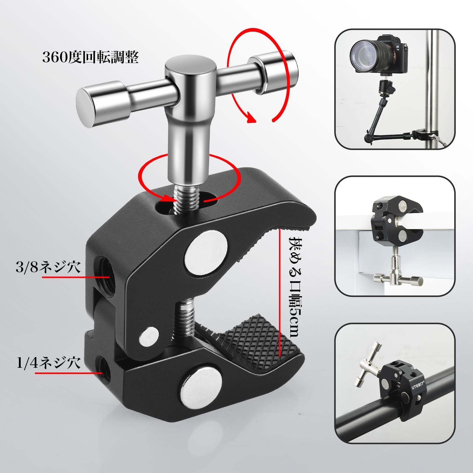 【送料無料】UTEBIT カメラ クランプ 耐荷重2kg カニクランプ 1点セット 蟹バサミクランプ 1/4'' 3/8'' ネジ変換アダプタ付き c型クランプ カメラ スーパークランプ 雲台 60mm径パイプクランプ カメラ アーム アルミ合金製 カニクランプ 360度回転可 緩み防止 撮影 照明