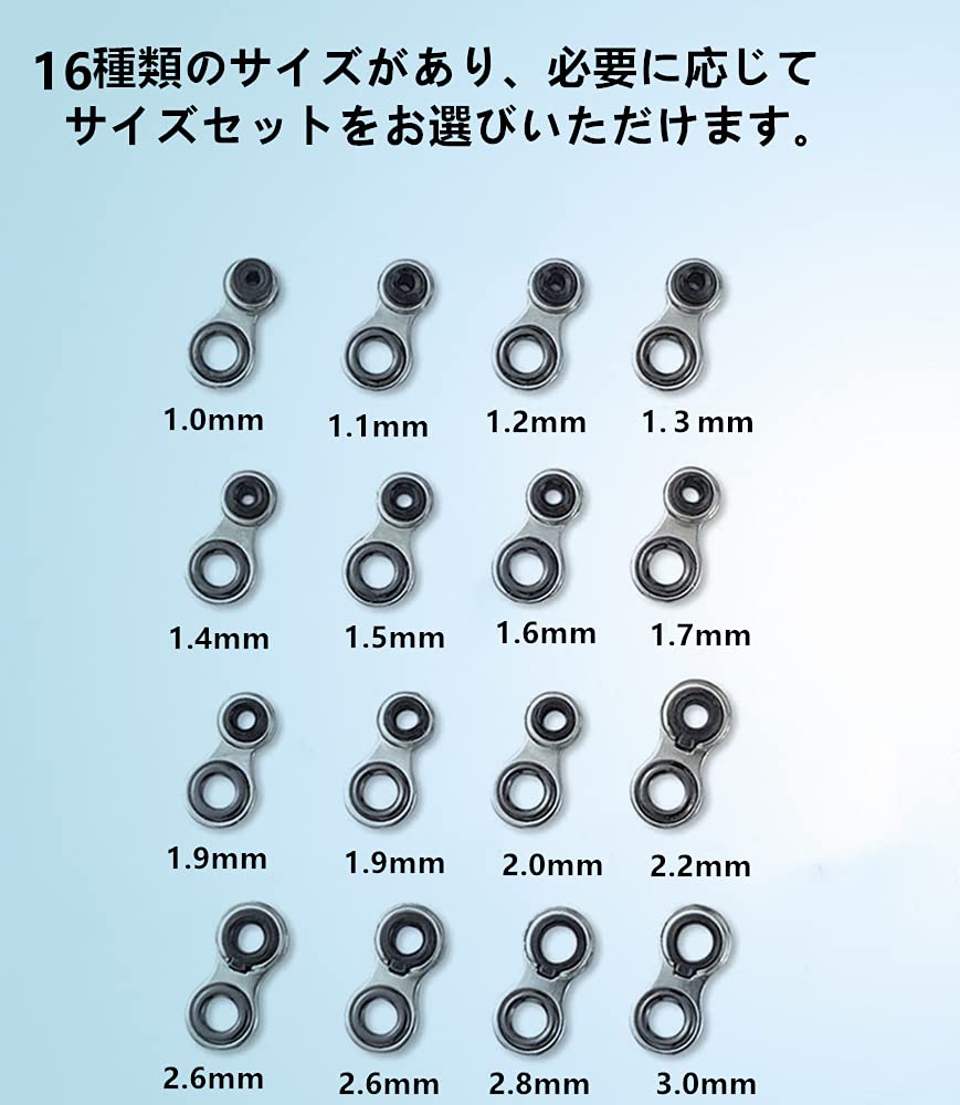 商品情報商品の説明主な仕様 ?1.セット内容:小さ目のロッドガイド16点セット。br?2.軽量設計:軽量で感度の高い強力、サイズ: 1.0mm/1.2mm/1.4mm/1.6mm/1.8mm/2.0mm/2.2mm/2.4mm/2.6mm/2.8mm/3.0mm。リングサイズ:すべて外径5mm、内径2.8mm。br?3.優れた素材:フレーム:ステンレス リング:セラミック。耐摩耗性・耐腐食性がいい、錆びにくいです。br?4.実用セット:16種類のサイズがあり、必要に応じてサイズセットをお選びいただけます。プロのアングラーにとっては、修理可能なロッドの範囲は広く、非常に実用的です。