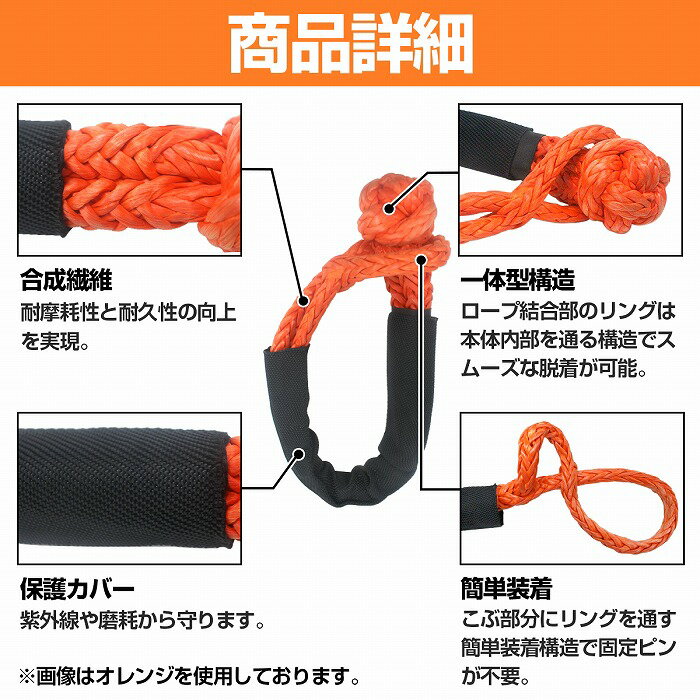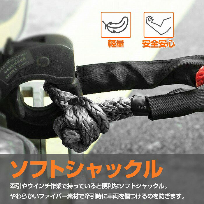 商品説明 牽引やウインチ作業で持っていると便利な「ソフトシャックル」。 通常のシャックルは重くて持ち運びにも不便ですが、ソフトシャックルは ソフトタイプロープなので軽量かつ車を傷つけません。 耐摩耗性と耐久性に優れた合成繊維を使用! こぶ部分をリングに通す簡単装着構造で固定ピンが不要です。 リングは本体内部を通る構造でスムーズな脱着が可能です。 保護カバーにより紫外線や摩耗からも保護します。 商品内容 カラー:イエロー/ブルー/ブラック/レッド/グリーン/オレンジ 長さ:約58cm 破断力:約15t ※説明書・マニュアル等は付属しません。 便利なスナッチリングやセットも取り扱っております。 スナッチリング単品 / ソフトシャックル&スナッチリングセット 送 料 送料:送料無料 (沖縄・離島・一部地域は別途送料加算となります) ※配送業者様のご指定はお受けできません。 保証について ※商品到着後、7日間の保証期間 お届けした商品に万一、不良・誤送・不備等あった場合、早急に対応させていただきます。 商品がお手元に届きましたらご確認をお願い致します。 期限が過ぎた場合は、いかなる場合でも対応できません。 ※お客様都合による返品・交換はお受けできませんのでご了承ください。 注意事項 必ず以下の注意事項をご確認ください。 ご注文は、同意の上されたものとさせていただきます。 注意事項について 商品が到着しましたら、必ず商品内容をご確認ください。 ◆買い間違いによります交換・返品等は受け付けておりません。 ◆商品画像につきましては、モニターの環境によって実際と色味が違う場合もございます。 ◆輸入品の為、スレ、汚れ等がついている場合がございます。 ◆輸入品の為、取扱・取付等の説明書が付属していない場合がございます。 ◆当店は販売のみとなりますので、取付や使用方法などのサポートはお受けできません。 ◆入荷時期により予告なく商品仕様が変更される場合がございます。