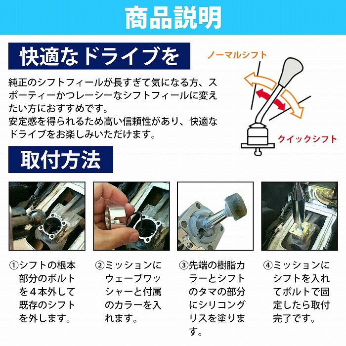 商品説明 ショートシフターで素早いシフトワークが可能! 非常に頑丈な作りとなっており耐食性・耐久性があります。 スピード感がありつつも、安定感のあるシフトチェンジが可能です。 純正のシフトフィールが長すぎて気になる方や、 スポーティーかつレーシーなシフトフィールに変えたい方におすすめです。 商品内容 適合車種:アルテッツア SXE10 GXE10の全年式 サイズ詳細 画像参照 ※適合は6速マニュアルミッション ※参考適合車種をご確認の上、お買い求めください。 送 料 送料:送料無料 (沖縄・離島・一部地域は別途送料加算となります) ※配送業者様のご指定はお受けできません。 保証について ※商品到着後、7日間の保証期間 お届けした商品に万一、不良・誤送・不備等あった場合、早急に対応させていただきます。 商品がお手元に届きましたらご確認をお願い致します。 期限が過ぎた場合は、いかなる場合でも対応できません。 ※お客様都合による返品・交換はお受けできませんのでご了承ください。 注意事項 必ず以下の注意事項をご確認ください。 ご注文は、同意の上されたものとさせていただきます。 注意事項について 商品が到着しましたら、必ず商品内容をご確認ください。 ◆買い間違いによります交換・返品等は受け付けておりません。 ◆商品画像につきましては、モニターの環境によって実際と色味が違う場合もございます。 ◆輸入品の為、スレ、汚れ等がついている場合がございます。 ◆輸入品の為、取扱・取付等の説明書が付属していない場合がございます。 ◆当店は販売のみとなりますので、取付や使用方法などのサポートはお受けできません。 ◆入荷時期により予告なく商品仕様が変更される場合がございます。