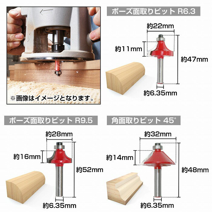 商品説明 ルータービットセット 木材、デコラ、合板などの素材の加工用に最適なルータービットセットです。 多種多様な形とサイズがセットになっているので、様々なシーンで活躍することができます。商品内容 ◆セット内容 (15本) / 刃径×刃長 (軸径は全て6.35mm) U字溝ビット R3 / 6mm×6mm U字溝ビット R6 / 12mm×10mm V字溝ビット 12mm-90°/ 12mm×12mm アリ錐ビット 12mm-14°/ 12mm×12mm サジ面取りビット R9 / 12mm×9mm ストレートビット 12mm / 12mm×12mm ストレートビット 12mm / 12mm×20mm ストレートビット 16mm / 16mm×20mm ストレートビット 3mm / 3mm×10mm ストレートビット 6mm / 6mm×20mm ヒョータン面取りビット R4 / 25mm×12mm ボーズ面取りビット R6.3 / 22mm×11mm ボーズ面取りビット R9.5 / 28mm×16mm 角面取りビット 45°/ 32mm×14mm 目地払いビット 12mm / 12mm×13mm ※当商品は海外製品のため、多少の傷、汚れなどがある場合がございます。 予めご了承の上、お買い求め下さい。 送 料 送料:送料無料 (沖縄・離島・一部地域は別途送料加算となります) ※配送業者様のご指定はお受けできません。 保証について ※商品到着後、7日間の保証期間 お届けした商品に万一、不良・誤送・不備等あった場合、早急に対応させていただきます。 商品がお手元に届きましたらご確認をお願い致します。 期限が過ぎた場合は、いかなる場合でも対応できません。 ※お客様都合による返品・交換はお受けできませんのでご了承ください。 注意事項 必ず以下の注意事項をご確認ください。 ご注文は、同意の上されたものとさせていただきます。 注意事項について 商品が到着しましたら、必ず商品内容をご確認ください。 ◆買い間違いによります交換・返品等は受け付けておりません。 ◆商品画像につきましては、モニターの環境によって実際と色味が違う場合もございます。 ◆輸入品の為、スレ、汚れ等がついている場合がございます。 ◆輸入品の為、取扱・取付等の説明書が付属していない場合がございます。 ◆当店は販売のみとなりますので、取付や使用方法などのサポートはお受けできません。 ◆入荷時期により予告なく商品仕様が変更される場合がございます。