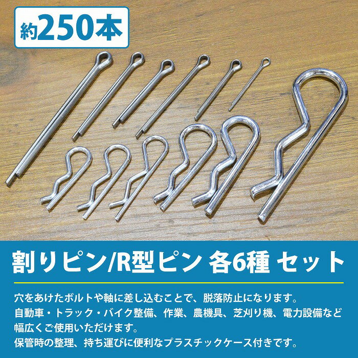 商品説明割りピン6種&Rピン6種 250本セット穴をあけたボルトや軸に差し込むことで、脱落防止になります。自動車・トラック・バイク整備、作業場、農機具、芝刈り機、電力設備など幅広くご使用いただけます。保管時の整理、持ち運びに便利なプラスチックケース付きです。●ボルトの抜け止めや回り止めに●驚きの大容量!6種類のサイズセット●亜鉛メッキコーティングで耐食性と防錆性があり、湿気のある環境も使用できます●取付けは穴に差し込み、頭を押し込みながらテールをペンチで開いて固定します●割りピンが長ければ、ペンチで切断して使用できます●自動車、機械、車のガレージ、ワークショップ、電力設備、車、トラック、芝刈り機小型エンジンの修理、および固定などに使用されます●保管時の整理、持ち運びにも便利!プラスチックケース入商品内容◆セット内容割りピンサイズ(軸の溝径)- 個数・1×32mm-約8個・2×35mm-約15個・3×40mm-約20個・2×50mm-約25個・3×50mm-約30個・4×74mm-約42個Rピンサイズ(軸の溝径)- 個数・24×74mm-約8個・16.5×45mm-約15個・16×40mm-約20個・11×40mm-約25個・11×34mm-約30個・11×29mm-約42個※表記個数は目安で、ロットにより前後する場合があります。※本商品は輸入品のため、ケースの割れや、欠けや不揃いのピンがある場合がございます。予めご了承ください。送 料送料:送料無料 (沖縄・離島・一部地域は別途送料加算となります)※配送業者様のご指定はお受けできません。保証について※商品到着後、7日間の保証期間 お届けした商品に万一、不良・誤送・不備等あった場合、早急に対応させていただきます。 商品がお手元に届きましたらご確認をお願い致します。 期限が過ぎた場合は、いかなる場合でも対応できません。 ※お客様都合による返品・交換はお受けできませんのでご了承ください。注意事項必ず以下の注意事項をご確認ください。 ご注文は、同意の上されたものとさせていただきます。 注意事項について 商品が到着しましたら、必ず商品内容をご確認ください。 ◆買い間違いによります交換・返品等は受け付けておりません。 ◆商品画像につきましては、モニターの環境によって実際と色味が違う場合もございます。 ◆輸入品の為、スレ、汚れ等がついている場合がございます。 ◆輸入品の為、取扱・取付等の説明書が付属していない場合がございます。 ◆当店は販売のみとなりますので、取付や使用方法などのサポートはお受けできません。 ◆入荷時期により予告なく商品仕様が変更される場合がございます。 ◆弊社商品不良によって起因した工賃の補償はございません。 また、商品以外の費用の補償もできませんので、予めご了承下さい。