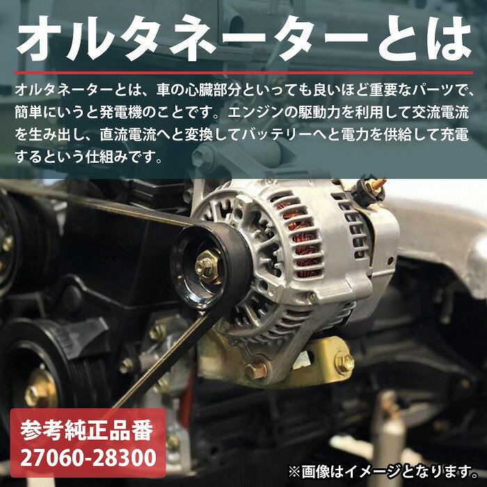 商品説明オルタネーターは、車の心臓部分といっても良いほど重要なパーツで、簡単にいうと発電機のことです。エンジンの駆動力を利用して交流電流を生み出し、直送電流へと変換してバッテリーへと電力を供給して充電するという仕組みです。■ オルタネータが故障したときの症状・エンジンが掛かっている時にチャージランプが点灯する・夜間走行中にヘッドライトが暗い・走行中にエンジンが止まりその後もエンジンが掛からない・オルタネーターから異音がする上記症状はオルタネーター自体の不良が考えられるので早めのご交換が必要になります。※面倒なコア返却は不要です♪商品内容【セット内容】オルタネーター×1【参考純正品番】27060-28300【参考適合車種】ダイハツアルティス ACV40N ACV45NトヨタRAV4 ACA31W・ACA36W・ACA36Wヴァンガード ACA33Wブレイド AZE154H・AZE156HマークXジオ ANA15・ANA10※適合車両は目安です。年式、仕様などにより適合品が異なる場合がございます。ご注文いただく前に、必ず純正品番号から適合をお確かめください。弊社でも適合確認を承っております。【お問い合わせフォーム】またはお電話にて車台番号をお知らせください。なお、車種やメーカーによっては回答できないものもありますのでご了承ください。※商品に関しての取り付けサポート等は弊社では出来かねますので、専門業者などにご相談ください。※ロットにより、商品のデザインや仕様が予告なく変わる場合がございます。予めご了承ください。送 料送料:送料無料 (沖縄・離島・一部地域は別途送料加算となります)※配送業者様のご指定はお受けできません。保証について※商品到着後、7日間の保証期間 お届けした商品に万一、不良・誤送・不備等あった場合、早急に対応させていただきます。 商品がお手元に届きましたらご確認をお願い致します。 期限が過ぎた場合は、いかなる場合でも対応できません。 ※お客様都合による返品・交換はお受けできませんのでご了承ください。注意事項必ず以下の注意事項をご確認ください。 ご注文は、同意の上されたものとさせていただきます。 注意事項について 商品が到着しましたら、必ず商品内容をご確認ください。 ◆買い間違いによります交換・返品等は受け付けておりません。 ◆商品画像につきましては、モニターの環境によって実際と色味が違う場合もございます。 ◆輸入品の為、スレ、汚れ等がついている場合がございます。 ◆輸入品の為、取扱・取付等の説明書が付属していない場合がございます。 ◆当店は販売のみとなりますので、取付や使用方法などのサポートはお受けできません。 ◆入荷時期により予告なく商品仕様が変更される場合がございます。 ◆弊社商品不良によって起因した工賃の補償はございません。 また、商品以外の費用の補償もできませんので、予めご了承下さい。