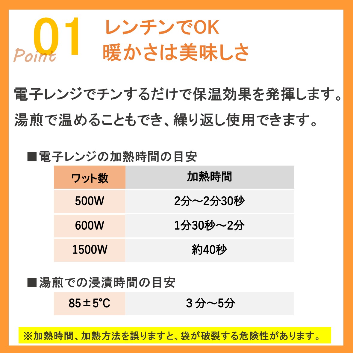 スノーパック ほかほかパックはレンジでチンするだけの簡単保温剤です。 ・電子レンジでチンするだけで、強力は保温効果を発揮します。 ・お弁当、ピザ、カレー等のできたての美味しさを保ちます。 ・宅配ピザやレストランのテイクアウト等に利用されています。 ・湯煎で温めることもでき、繰り返し使用できます。 ・寒い日に手元を温めたい時などはホッカイロの代わりにもお使い頂けます。 ・レンジでチンして、布団に入れておけば、手軽に寝る前のお布団を温めることができます。 ■仕様 品番:200 重量:500g サイズ(mm):160x230 内容物:カルボキシメチルセルロース ■使用方法 ・600Wの電子レンジで2分、500Wで2分30秒加熱して下さい。 ・環境温度が低く、暖かさが足りない場合は10秒ずつ再加熱して下さい。 ・湯煎の場合は、沸騰したら火を止めて保温剤を温めて下さい。 ※加熱の目安/ご使用の電子レンジによって加熱時間が変わります。 ※加熱時間、加熱方法を誤りますと、袋が破裂する危険性があります。 ■注意事項 お使いのモニターの発色具合によって、実際のものと色が異なる場合がございます。保温剤 ほかほかパック スノーパック 保温 500g 1個 2個 3個 10個 日本製 国産 温める あったか デリバリー フードデリバリー ピザ お弁当 カイロ 湯たんぽ 暖 三重化学工業 おしゃれ