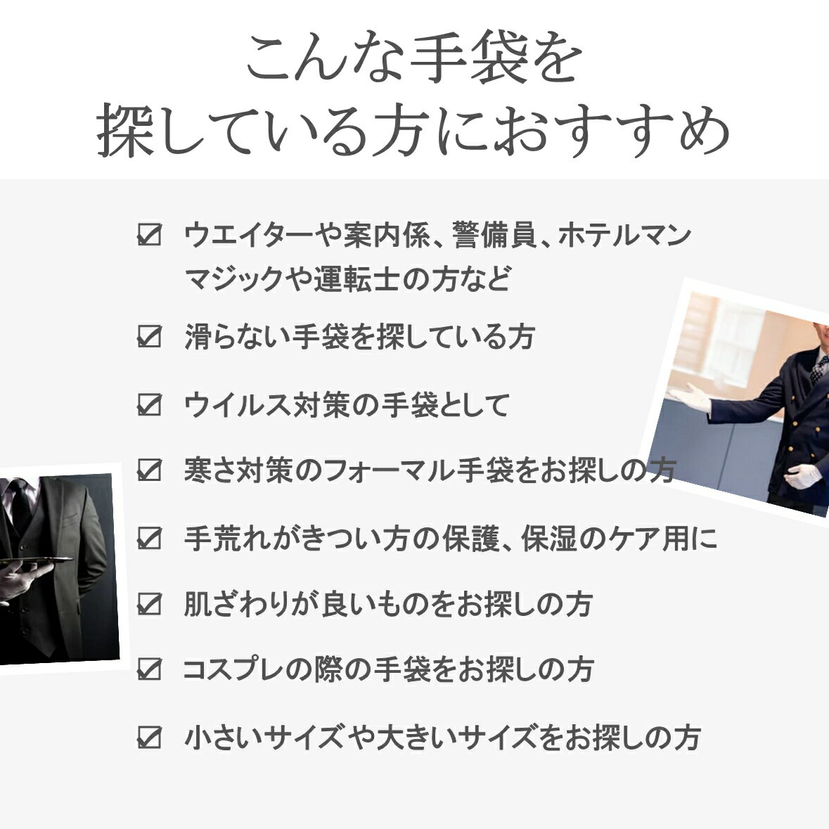 裏起毛の防寒手袋ですが、スマホ操作に対応しておりますので、寒い冬でも手袋を脱ぐ必要はありません。掌にはシリコンの滑り止めが付いており、スマホ操作時も滑り難くなっております。もちろん適度なグリップの為、ドライブや軽作業にも好適です。 ・サイズ(全長):S(22cm)、M(23.2cm)、L(24.2(cm)、LL(25.5cm) ・指先部タッチパネル操作対応(親指、人差し指、中指) ・三本飾り付き ・シリコン滑り止め付き ・素材 ポリエステル/ナイロン/スパンデックス ・カラー アイボリー ・注意事項:お使いのモニターの発色具合によって、実際のものと色が異なる場合がございます。 [礼装用 フォーマル ドライブ 軽作業 冬用 防寒 滑り止め]礼装用手袋 防寒手袋 1双 スマホ対応 スマホ 防寒 礼装用 暖かい 裏フリース 手袋 白白手袋 礼装用白手袋 厚手 滑り止め付き 滑り止め 冬用 作業用 ドライバー用 お遍路 遍路 選挙 警備員 警備 観光 s m l ll メンズ レディース 男性用 女性用 おしゃれ