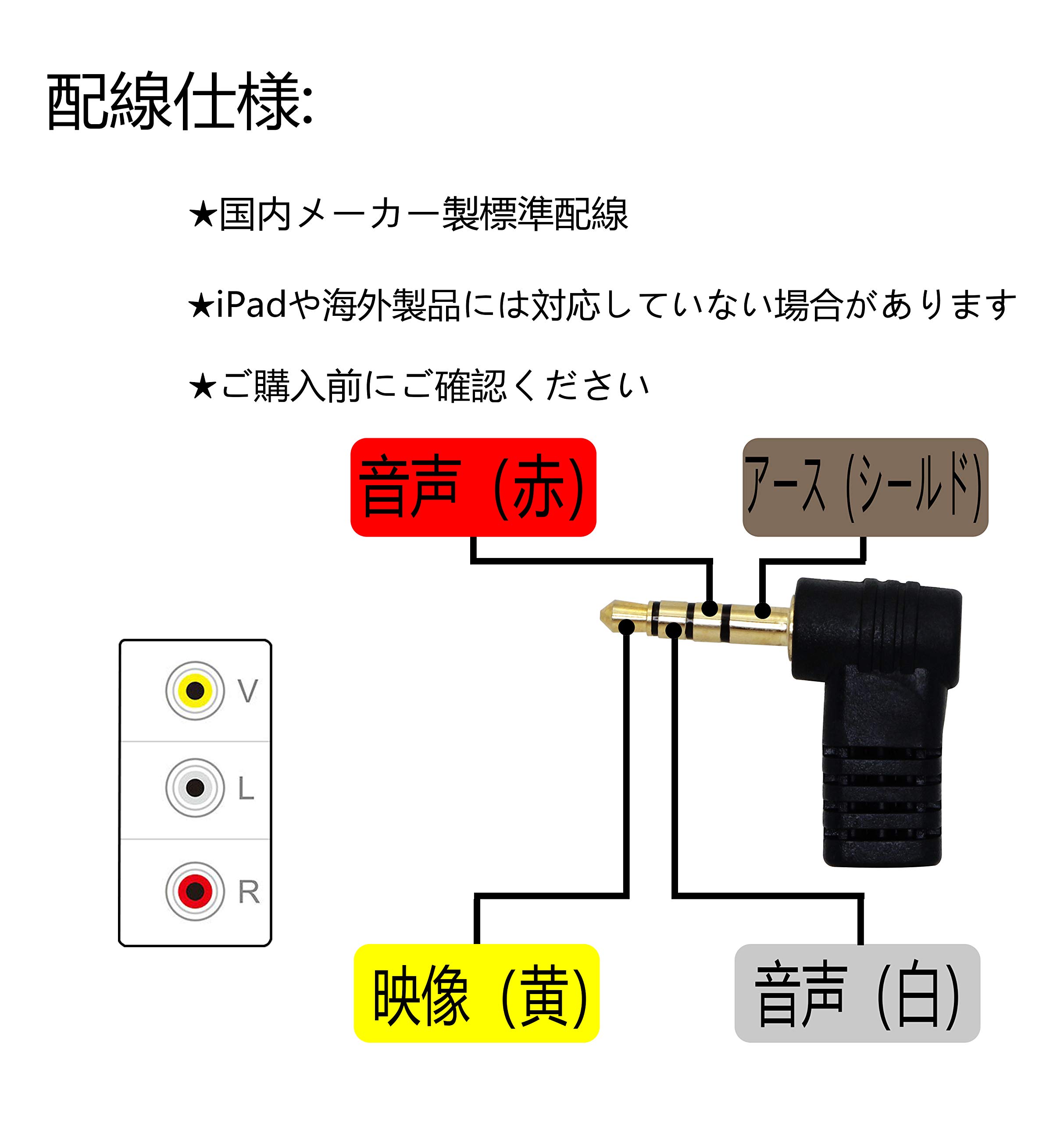 商品情報商品の説明主な仕様 このオーディオ-RCAケーブルは、3.5mmジャックを3つのRCAジャックに分割します。 このRCAメスケーブルを使用すると、信号を分割したり、ある接続から別の接続に適応したりできます。br4極ミニ配列(先端から順に)■1極(先端):映像(黄)、2極(2番目):音声(白)、3極(3番目):音声(赤)、4極(プラグ根本):アース(GND)。br出力3.5プラグ信号装置を装備することができます、3.5ヘッドからRCAの女性の座席への信号、RCAプラグ関連機器を使いやすい。br金メッキのプラグ。3.5mmミニAVインターフェースを介してオーディオとビデオの両方の信号を出力できるデバイスにのみ対応しています。スマートフォンにはご使用いただけません、規格が統一されていないため配線パターンをご確認ください。br対応機器:AV出力端子(3.5mm4極ミニプラグ型)搭載機器、例:ポータブルナビ、ポータブルプレーヤー、VTR機器、ポータブル液晶テレビ、タブレットPC、ビテオカメラ等。