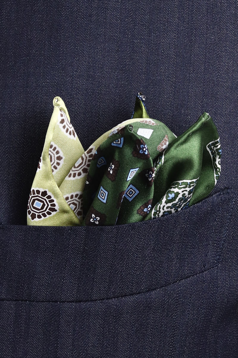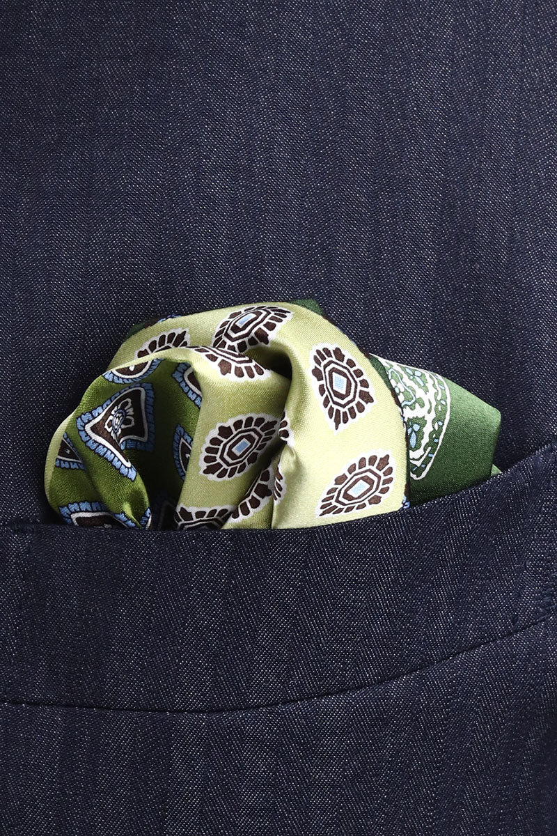 フェアファクス FAIRFAX 4面 ポケットチーフ 小紋柄 プリント グリーン×オリーブ濃淡 シルク100% 日本製 ハンドロール メンズ