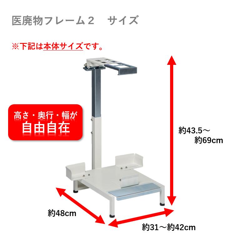 医廃物容器(樹脂ペール)をセットできるフレームです ・可変式フレーム 高さ・奥行・幅が自由自在に変更できるので、様々な大きさのゴミ箱に対応! 樹脂ペールの医廃物容器に対応 踏み込みやすい大型ペダル付き ダンパー付きで蓋が静かに閉まるので患者さんへの騒音に配慮できます。 ●商品概要 [材質]本体:スチールにメラミン焼付塗装 [本体サイズ]最小:幅310×奥行480×高さ435mm、最大:幅420×奥行480×高さ690mm [重量]約6.0kg ※医廃物容器(樹脂ペール)は付属しません。 ※取り付け可能な蓋の厚さ:約18mm(薄すぎても厚すぎても固定できません。) ※対応容器サイズは、最小:幅270×奥行250×高さ320mm、最大:幅410×奥行280×高さ570mm です。 医廃物容器フレーム可変式(段ボール専用)はこちらから