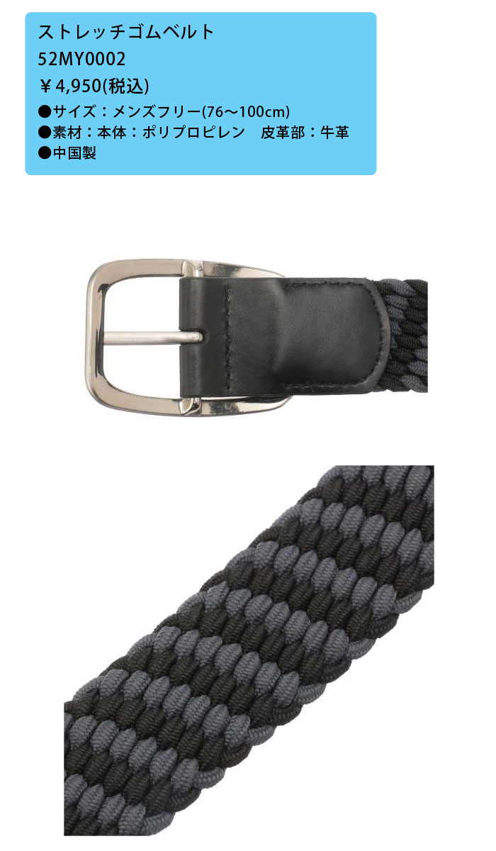 ストレッチゴムベルト 52MY0002 ストレッチの効いた素材を使用したベルト。調節が自在でフィット感に優れています。カラー配色も豊富でいろんなカラーコーディネートに対応できます。 ●サイズ:メンズフリー(76〜100cm) ●素材:本体:ポリプロピレン 皮革部:牛革 ●中国製