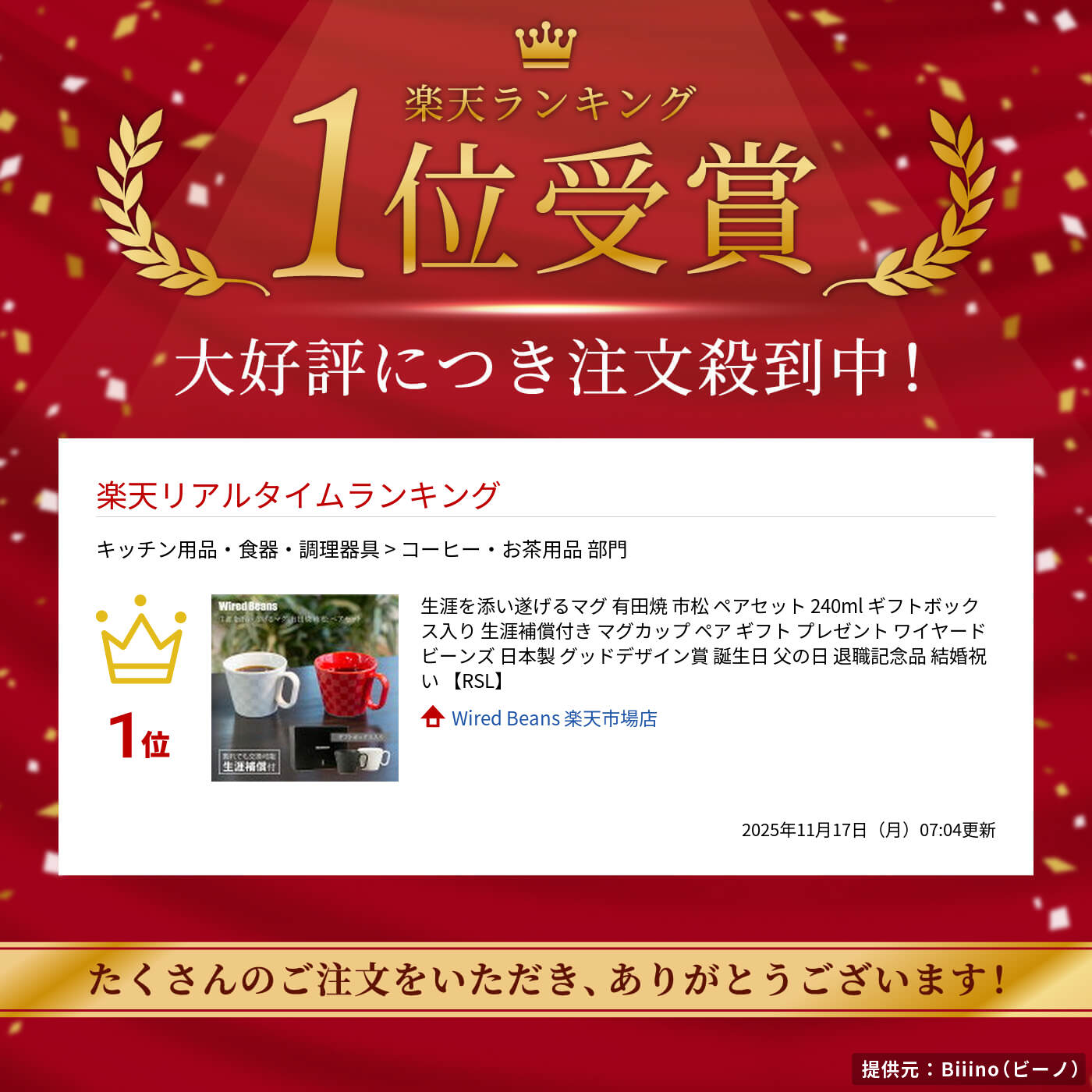 【ご購入の前に】・製造工程や素材の特性により、サイズ、形状、容量、重さ、厚み、色、模様、風合いにばらつきが生じます。また、多少のがたつきやゆがみ、凹凸、キズや擦れ、小穴(ピンホール)、鉄粉(黒点)、釉薬のムラなどが見られることがあります。これらの特徴は焼き物の個性や表情としてご理解いただき、ご購入の際にはご留意ください。商品名生涯を添い遂げるマグ 有田焼(ありたやき) 市松(いちまつ) ペアセットカラーブラックマット・ホワイトマット レッド・ホワイト本体サイズレギュラーサイズ 口径約91mm 高さ約74mm(取手含まず)満水容量約240ml本体重量210g前後/個素材磁器外箱(付属箱)紙箱:ギフトボックス(約長さ155×幅205×高さ95mm) ※デザイン・サイズなどは予告なく変更となる場合がございます。予めご了承ください。付属品説明書 補償書 他 ○付属品は付属箱内に同梱します。 ○補償書は製品本体ごとに1枚です。セットの場合、製品本体の数だけ補償書を同梱します。お取り扱い上の注意電子レンジ:○ 食器洗浄機:○ オーブン・直火:× ○電子レンジ・食器洗浄機でご使用いただけます。 ○オーブン・直火には使用できません。 ○強い衝撃や過度の急熱・急冷を与えると破損のおそれがあります。 ○クレンザーや研磨剤の付いたスポンジの使用はマグを傷つけますのでお控えください。 ○割れたマグの取り扱いには十分ご注意ください。その他底面にはプロダクトロゴと窯元印が入ります。工程上、見えにくい場合やデザイン・位置などが予告なく変更となる場合がございます。予めご了承ください。手づくりの想い *製品仕様について本製品はサイズや厚みのばらつき、凹凸が見られる場合がありますが、これは手づくりの証です。 ・サイズは、高熱の炉の中の置く位置によってばらつきが生じます。 ・厚みや凹凸は、職人が釉薬を付けるときの業から偶然生まれるものです。 ・内部底面の丸みは、エスプレッソ系コーヒーの良質な泡をつくり出すために工夫されたものです。 どうぞ、職人の心意気がいっぱいの、手づくりの良さを感じてください。「市松模様」でモダンデザインに日本らしさを生涯を添い遂げるマグ 有田焼 市松 ペアセット江戸時代・安政年間創業の辻与製陶所 与山窯の職人がつくる「生涯を添い遂げるマグ 有田焼 市松」。江戸時代に着物の柄として流行したことでも知られる、日本古来の「市松模様」「市松格子」を上絵付けし、和の趣と現代の感性を融合させた和モダンな仕上がり。素材の質感から生まれる存在感と、日常使いにぴったりな機能性を兼ね備えています。コーヒーをより深く楽しむひとときを、ぜひお楽しみください。 「ブラックマット・ホワイトマット」「レッド・ホワイト」のマグを、プレゼントにもそのままご利用いただけるギフトボックスに入れてお届けいたします。 有田焼(ありたやき)とは 有田焼は佐賀県有田町を中心に生産される磁器を指します。日本で初めて作られた磁器であり、江戸時代以前より焼かれ、現在では経済産業大臣指定伝統工芸品に指定されています。ブラックマット・ホワイトマットセット内容 ・製品1:有田焼 レギュラー 市松 ブラックマット×1 ・製品2:有田焼 レギュラー 市松 ホワイトマット×1 ギフトボックス入り(小サイズ/ブラック)手に馴染むマットな質感と深みのあるブラックカラーが魅力。落ち着いた上品さと控えめな存在感で、洗練された印象を与えます。どんな空間にも馴染みやすく、長く愛用したくなる一品です。柔らかな雰囲気をまとったホワイトマットは、マットな質感が手に心地よくフィットします。シンプルながらも市松模様が陰影を生み出し、さりげない奥行きと品格を感じさせるデザインです。日々の暮らしに、穏やかな彩りを添えます。レッド・ホワイトセット内容 ・製品1:有田焼 レギュラー 市松 レッド×1 ・製品2:有田焼 レギュラー 市松 ホワイト×1 ギフトボックス入り(小サイズ/ブラック)鮮やかで艶やかなレッドは、テーブルに華やかなアクセントを加える存在感抜群のカラー。還暦祝いなどの特別なギフトにも選ばれ、喜びや祝福の気持ちを鮮明に伝えます。見るたびに元気をもらえるような明るさが魅力です。白磁の美しい艶と、繊細な市松模様が融合したホワイト。明るく清潔感のある色合いが、模様の凹凸を際立たせ、シンプルながらも印象的な仕上がりに。食卓やインテリアに馴染みつつ、特別感を添えます。プレゼントにもそのまま利用できるギフトボックス入りギフトボックスにリボン掛けやのし掛けも対応可能です。ご希望の際は「ギフトサービス」からご選択ください。日本の職人による手づくり辻与製陶所 与山窯(佐賀県嬉野市) 挑戦し、もの造りを繰り返す。 辻与製陶所 与山窯(つじよせいとうしょ よざんがま)は、辻与介氏が約160年前の江戸時代後期・安政年間に創業。佐賀県嬉野市に位置する「肥前吉田」にて、脈々とその伝統技術を受け継ぎ発展させてきました。磁器か