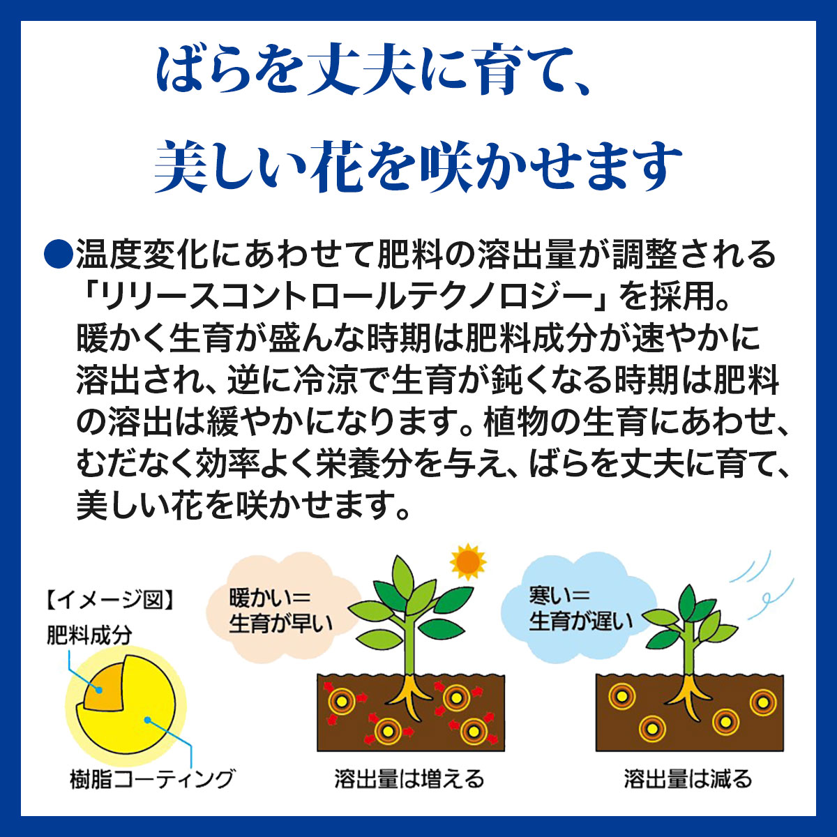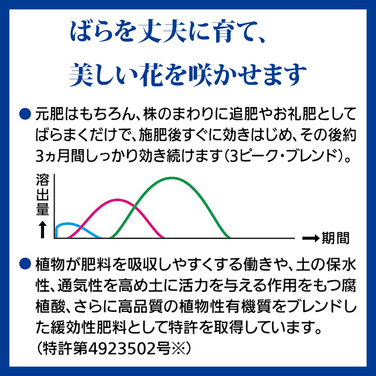 元肥はもちろん、株のまわりにも追肥としてばらまくだけで、施肥後すぐに効きはじめ、その後2〜3カ月間しっかり効き続けます(3ピーク・ブレンド)。植物が肥料を吸収しやすくする働きや、土の保水性、通気性を高め土に活力を与える作用をもつ腐植酸、さらに高品質の植物性有機質をブレンドした緩効性肥料として特許を取得しています。(特許第4923502号:住友化学(株))温度変化にあわせて肥料の溶出量が調節される「リリースコントロールテクノロジー」を採用。暖かく生育が盛んな時期は肥料成分が速やかに溶出され、逆に冷涼で生育が鈍くなる時期は肥料の溶出は緩やかになります。植物の生育に合わせ、むだなく効率よく栄養分を与え、ばらを丈夫に育て、美しい花を咲かせます。成分:N:P:K:Mg=10:13:6:1保証票の種類:指定配合肥料 生産業者保証票剤型:粒状備考:指定配合肥料 生産業者保証票 エード粒状5号有機入り:N:P:K:Mg:B=10:13:6:1:0.012使用方法元肥として使用する場合植物を植える前にあらかじめ土に施します。植え付け、植え替え、種まき時に適量を土に混ぜ込みます。※肥料が直接根に触れても肥料焼けしません。追肥として使用する場合植物を植えた後に生長に応じて、株元に均一にばらまきます。2〜3ヵ月間隔で、株元に均一にばらまきます。 上記使用量を目安に植物の生育にあわせて加減してください。生長期に液体肥料(「マイローズばらの液体肥料」など)と併せて与えるとさらに効果的です。注意事項本品は食品ではありません。食べられません。原料に天然の鉱物を使用しているため、配合された一部の粒で、製品ごとに色が異なる場合がありますが、肥料効果には影響ありません。開封後は密封し、飲食物・食器類やペットの餌と区別し、直射日光をさけ、小児の手の届かない冷涼で乾燥した場所に保管。検索ワード:丈夫 専用 配合 肥料 バラ 肥料 バラの肥料 バラ肥料 腐植酸 肥料 緩効性肥料 バラ 緩効性肥料 ばら肥料 薔薇肥料 住友化学園芸 バラ 肥料 ガーデニング 肥料 園芸 肥料 MY ROSES マイローズ バラ 肥料 住友化学園芸 旧住友化学園芸 元住友化学園芸 キンチョー キンチョー園芸 金鳥