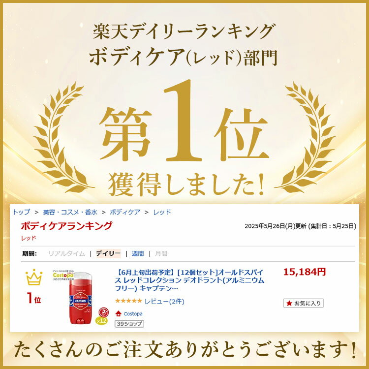 商品説明 ●創業はなんと1937年!オールドスパイスはメンズ向けグルーミング (身だしなみケア) 製品の定番として、世代を越えて愛され続けるブランドです。 ●体のニオイが気になったときにこれ一本♪汗の匂いをしっかりカバーしてくれるデオドラント◎ ●いつでもどこでも簡単ニオイケア!スティックタイプで、汗ばむところにサっと塗れる♪ ●柑橘の爽やかさと、フローラルな甘さを併せ持ったベルガモットの香り。 ●壮大な海に吹く、爽やかな風のような香りをイメージで、まるでずっとビーチにいるような香りに包まれます。 ●どんな場面でも上品でクリーンな印象を与えられます◎ ●クリアに伸びるので、衣服に白い跡がつきにくい! ※アルミニウムフリー 香り違いはこちら デオドラントをもっと見る 消費期限・使用期限の確認はこちら 内容量 85g(3oz) 成分内容 詳細は画像をご確認ください ※詳しくはメーカーサイトをご覧ください。 使用方法 容器下部のダイヤル部分を回し、スティックを適量出してください。乾いた清潔な脇に塗布してご使用ください。 メーカー Old Spice (オールドスパイス) ・外用です。口の中に入れないようにしてください。 ・粘膜・傷んだ皮膚には使用しないでください。 ・お子様の手の届かない場所で保管してください。 ・お肌に合わない場合は使用をやめ、症状によっては医師にご相談ください。 ・効能・効果の表記は薬機法により規制されています。 ・医薬品該当成分は一切含まれておりません。 ・メーカーによりデザイン、成分内容等に変更がある場合がございます。 ・製品ご購入前、ご使用前に必ずこちらの注意事項をご確認ください。 Red Collection Captain Deodorant 3oz 生産国: アメリカ 区分: 化粧品 広告文責: ㈱ REAL MADE 050-3138-5220 配送元: CMG Premium Foods, Inc. Old Spice オールドスパイス おーるどすぱいす 男性 メンズ めんず 汗 あせ ニオイ 臭い 匂い におい 身だしなみ エチケット マナー 運動 うんどう 運動後 フィットネス ワークアウト トレーニング ジム 筋トレ スポーツ 人気 にんき おすすめ お勧め オススメ ランキング上位 らんきんぐ 海外 かいがい アメリカ あめりか スティック デオドラント でおどらんと 脇汗 ワキ わき すっきり さっぱり リフレッシュ 良い香り いい香り 清潔 清潔感 アルミニウムフリー 爽やか さわやか 好印象 柑橘 ふろーらる べるがもっと 上品 48時間 長持ち 香り長続き