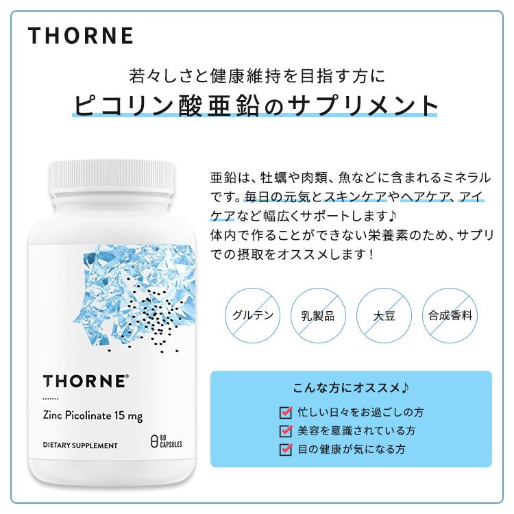 【P20倍★20日0時-12月11日9時】[5個セット]ソーン ピコリン酸亜鉛 ジンク ピコリネート 15mg サプリメント 60粒 カプセル Thorne Zinc Picolinate Capsules 健康維持 生活習慣 スキンケア 目の健康