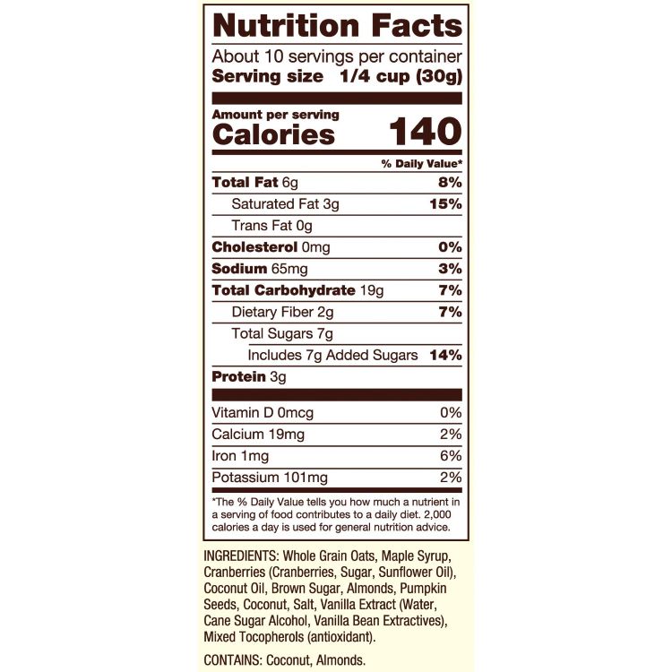 クランベリー アーモンド ホームスタイル グラノーラは、全粒オート麦、本物のメープル シロップ、ココナッツ、クランベリー、アーモンド、健康的な種子で作られています。フライパンでカリカリに黄金色になるまで焼き上げたので、まるで自分で作ったかのような味わいです。お出かけのときに手に取ってお召し上がりいただくか、ミルク、ヨーグルト、アイスクリームと一緒にお召し上がりください。