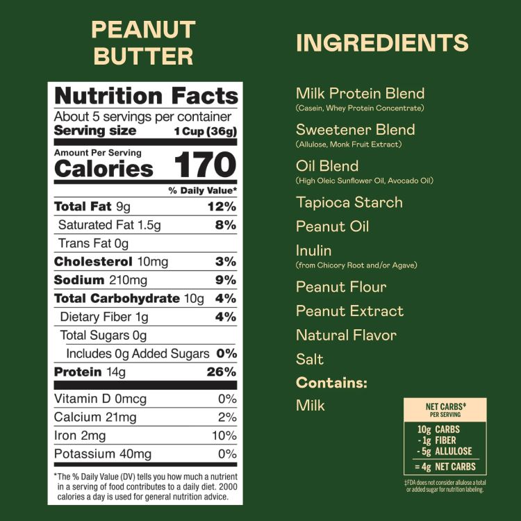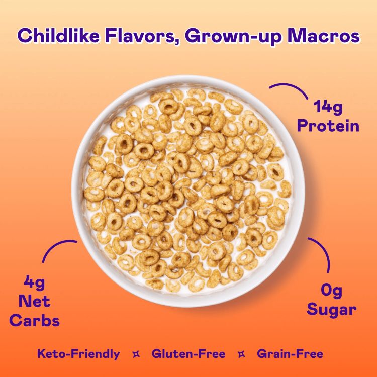 穀物不使用、グルテンフリーの朝食用シリアル ミルクプロテインブレンド、タピオカ澱粉、チコリ根繊維、天然香料を使用 羅漢果とアルロースで甘味付け 純炭水化物4グラム、タンパク質14グラム、糖質0グラム ケトフレンドリー 穀物、グルテン、小麦、大豆不使用 人工着色料や甘味料は使用していません