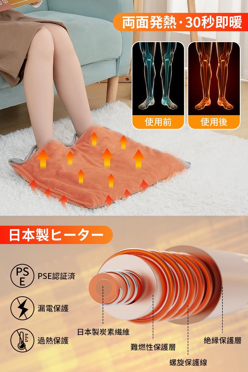 商品詳細 商品名 2025年冬最新改良版足温器(フートウォーマー) セット内容 足温器(フートウォーマー)×1、日本語説明書×1 適用場合 オフィス・自宅での足裏・背中・お腹・膝の保温、布団内ダニ対策、冬季暖房電気代節約、冷え性の女性・お年寄りへの贈り物 特徴 ・4点強化:新開発ダニ除去機能(ポリ袋に入れ布団間で2時間通電)、8段階温度調節&6段階タイマーアップグレード、足の甲カバー部加熱ワイヤー内蔵(360度上下両面加熱)、袋デザインにボタン追加(手足完全カバー・寒さシャットアウト) ・日本製ヒーター:30秒速暖、高熱伝導炭素繊維ヒーター採用、安全・高耐久性 ・PSE認証済み:過熱保護・リアルタイム監視・絶縁保護・難燃保護・線路保護装備、過温時自動電源オフ(破損・火傷防止) ・収納・洗濯対応:くるくる巻きデザイン(省スペース収納・持ち運び便利)、洗濯可能(洗濯後自然干し必須) ・多用途:足以外に背中・お腹敷き・膝掛け可、全身を温めることができる 仕様 【1】足温器本体 ・サイズ:55×40cm(コンパクト軽量) ・デザイン:くるくる巻き収納対応、袋部分ボタン付き(手足完全カバー・足首閉鎖可) ・洗濯対応:洗濯可能(洗濯後は自然干し、再使用前に乾燥状態を確認) ・ダニ除去機能:本体をポリ袋に入れ布団間に挟み、「ダニ対策」モードで約2時間通電して使用 【2】ヒーター仕様 ・種類:日本製炭素繊維ヒーター ・加熱性能:30秒速暖、360度上下両面加熱(足の甲カバー部加熱ワイヤー内蔵) ・認証:PSE認証済み ・安全機能:過熱保護、リアルタイム監視、絶縁保護、難燃保護、線路保護;過温時自動電源オフ(破損・劣化・火傷防止) 【3】温度調節&タイマー仕様 ・温度調節:8段階(35℃/38℃/42℃/45℃/48℃/52℃/55℃/60℃)、任意に切り替え可 ・タイマー機能:6段階(0.5H/1H/1.5H/2H/4H/6H)、設定時間到達後自動電源オフ(省エネ・安全対策) 【4】售后対応 ・不具合対策:万が一製品に不具合が発生した場合、返金・返品に対応いたします