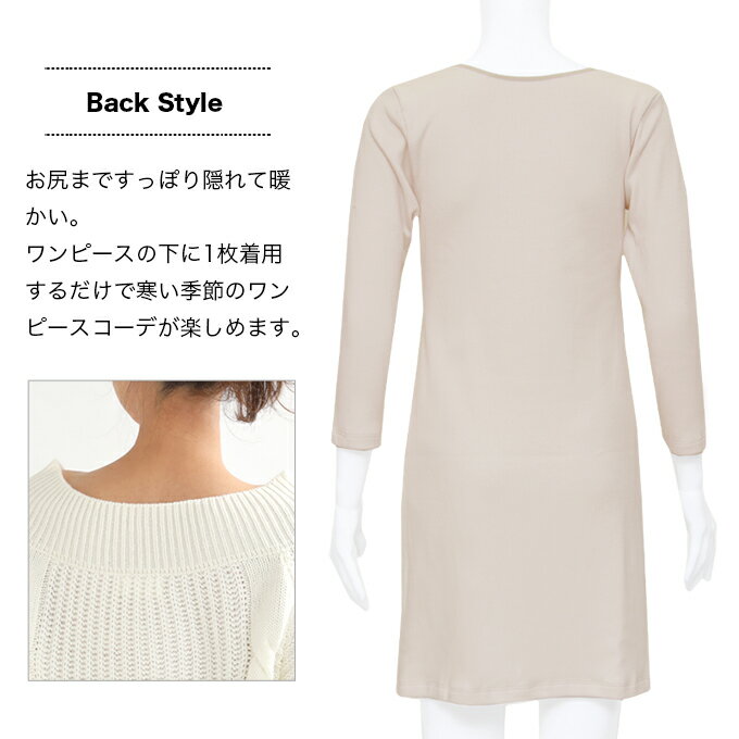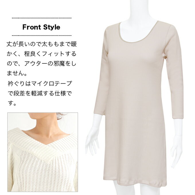 商品説明 商品紹介 丈が長いので太ももまで暖かく、程良くフィットするので、アウターの邪魔をしません。衿ぐりはマイクロテープで段差を軽減する仕様です。 お尻まですっぽり隠れて暖かい。ワンピースの下に1枚着用するだけで寒い季節のワンピースコーデが楽しめます。 素材 身生地:綿100% ゴムテープ部分:ナイロン、ポリウレタン サイズ展開 M/L/LL カラー展開 ローズ / ベージュ 特徴 日本製生地ストレッチ:横あり 注意 モニターの発色の具合によって実際のものと色が異なる場合があります