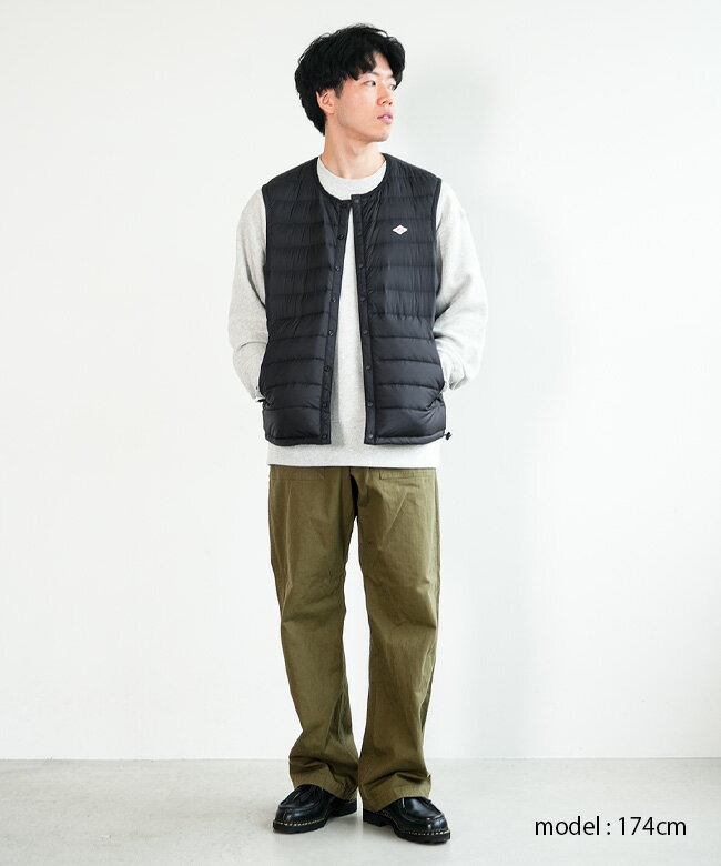メーカー希望小売価格はメーカー商品タグに基づいて掲載しています。保温性と利便性に優れる、DANTONの大定番シリーズ。 ・DANTONの秋冬の定番アイテム、INNNER DOWNシリーズのダウンベストがさらにアップデート。・程良くフィットするサイズ感のコンパクトシルエットはアウターの下にもすっきりと収まり、秋冬の防寒に大活躍する一着です。・高密度ナイロンタフタを使用した滑らかな質感と程よい光沢感はそのままに、2025AWシーズンよりリサイクルダウンを使用することで環境にも配慮されています。・軽量ながらも確かな保温性を備え、ジャケットやコートのインナー使いはもちろん秋口や春先にさっと羽織るアウターとしても最適。・胸元にはワンポイントとしておなじみのロゴワッペンを配し、裾にはドローコードを装備。・持ち運びに便利なスタッフサックが付属します。 着用カラー:090 BLACK/着用サイズ:L 身長:174cm/体重:66kg 【モデル着用感】程よくゆとりのあるシルエットです。着丈:ヒップが半分程度隠れます。アームホールには余裕があります。 【コーディネートアイテム】 tops / bottoms / shoes / ※近日発売予定の商品等はリンク切れしている場合が御座います。詳しくはお問い合わせください。 Color Variation ※こちらの画像が実際のお色に一番近くなっています。 生産国中国 素材表地:ナイロン100% 裏地:ナイロン100% 詰物:ダウン90% フェザー10%>>素材・生地・加工についての詳細はこちら 重さ175g(サイズM) Attention 透け感:なし / 伸縮性:裾部分のみあり / 裏地:あり / 内ポケット:なし ・ダウン製品は縫い目部分からダウン・フェザーが飛び出すことがあります。引き抜かないで中に押し戻してください。お取り扱いの際には、付属のタグを必ずご確認くださいませ。 ※屋外(太陽光)と、室内(蛍光灯)とでは色の見え方には違いがございます。ご使用のモニターや環境によっても色の見え方が異なりますことをご理解ご了承くださいませ。 洗濯商品の洗濯表示や取り扱いについてはこちら>>各種洗濯表示の意味はこちら サイズ身幅着丈肩幅アームホール M 54cm60cm40cm59cm L 56cm63.5cm41cm60cm XL 58cm65cm43cm63cm XXL 60cm67cm45cm65cm ※すべてサイズは実寸表記です。平置きにして採寸しておりますので、実際の着用感とは異なる場合がございます。また、一点一点若干の誤差が生じる場合もございます。肩と袖の切替の無い商品については、【裄丈】として採寸しております。>>採寸方法・靴サイズ表についてはこちら<< サイズにお悩みの方は、店舗での試着サービスがおすすめです!