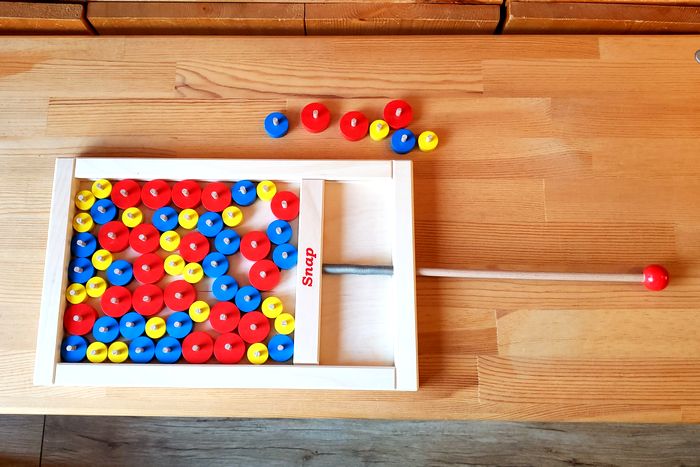 1人でもグループでも遊べるスリル満点ゲーム。 集中力と手際のよさに、少しの運が必要です。 <はじめに> スプリング付きの取っ手を引き、枠の中に66個のコマをすべてバラバラに並べます。 <遊び方> じゃんけんで勝った人から順番に、枠の中からコマを1つ取ります。 コマに1度触ったら、他のコマに変更できません。 枠を動かさずにコマを取れたら、同じ人が続けてコマを取り続けることができます。 取るときに枠が少しでも動いたら、そのコマを好きな場所に戻して、次の人に交代です。 コマの点数は、サイズが大きい順に赤3点、青2点、黄1点。 コマが在庫の1個になったら、ゲーム終了です。 取ったコマの合計点数が一番高かった人の勝ちです。 商品名 Snap 動かないで メーカー FAIRWERK社 ドイツ おすすめ 対象年齢 4歳ごろから プレイ人数 1人〜4人 ゲーム時間 約20分 サイズ・内容 コマ66個(赤、青、黄 各22個)、ボード1個 ボード:22×36cm 材質 木製・スプリング 類似商品はこちらうさぎのニーノ ペガサス社 ボードゲーム PG5,280円ねことねずみの大レース ペガサス社 PG6605,280円果樹園ゲーム ハバ社 HA4170 HABA 8,360円はじめてのゲーム 果樹園 ハバ社 HABA カ5,060円はじめてのゲーム フィッシング ハバ社 HA35,060円ガイスタートレッペ 2004年ドイツ年間子7,040円カーレース ハバ社 HABA HA4416 ア5,060円雲の上のユニコーン ハバ社 HA303315 3,080円ドイツ/ベック社 花こま880円新着商品はこちら2025/11/15大容量 花はじき 1kg カラー 白 ホワイト5,907円2025/11/15ミニネフスピール ネフ社 正規輸入品 nae11,000円2025/11/15ミニネフスピール 白木 ネフ社 正規輸入品 11,000円再販商品はこちら2025/11/30花はじき 100g カラー 白 ホワイト おま880円2025/11/30ネフ リングリィリング naef はじめての木4,180円2025/11/30ネフ ドリオ はじめての木のおもちゃ naef6,490円2025/11/30 更新