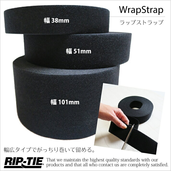 商品説明 切って使える両面タイプ ラップストラップは片面がフック(オス)、反対の面がループ(メス)の両面タイプの結束バンドです。束ねたいものの太さに合わせて自由に切ってお使いください。 繰り返し200回以上使用可能 業務用製品としてRip-Tie Inc.での厳しい耐久テストをクリアしています。約200回までは同じ圧着強度を保ち、徐々に弱くなっていく高品質なケーブルバンドです。 こちらの商品は幅100mm×1mパックとなります。 ・幅100mm×3m巻はこちら! ・幅100mm×22m巻はこちら! 仕 様 ・商品サイズ:幅101.6mm×長さ1m ・数量:1パック ・素材:フック:ポリエチレン ループ:ナイロン ・動作温度:-17℃〜105℃ ・シアー強度/縦方向:80kg@1平方cm(フックとループの重なり5cm以上で) ・シアー強度/横方向:80kg@1平方cm(フックとループの重なり5cm以上で) RIP-TIEについて リップタイ製品は放送・通信・イベント制作業界向けのケーブルや配線をまとめるために開発されたケーブルバンドです。 日本では結束バンドやタイラップ、マジックテープなどがおなじみの言葉かもしれません。 ほとんどの商品がマジックテープ同様のナイロン素材でできています。 色の発色が良く、美しくカラフルで ありながら業務用途として開発されているので大変丈夫です。 (繰り返し使用強度200回〜10,000回以上)下記のラップストラップ幅リンクをクリックすると、商品ページが表示されます。 幅6.3mm 幅9.5mm 幅12mm 幅15.8mm 幅19.0mm 幅25.4mm 幅38.1mm 幅50.8mm 幅101.6mm