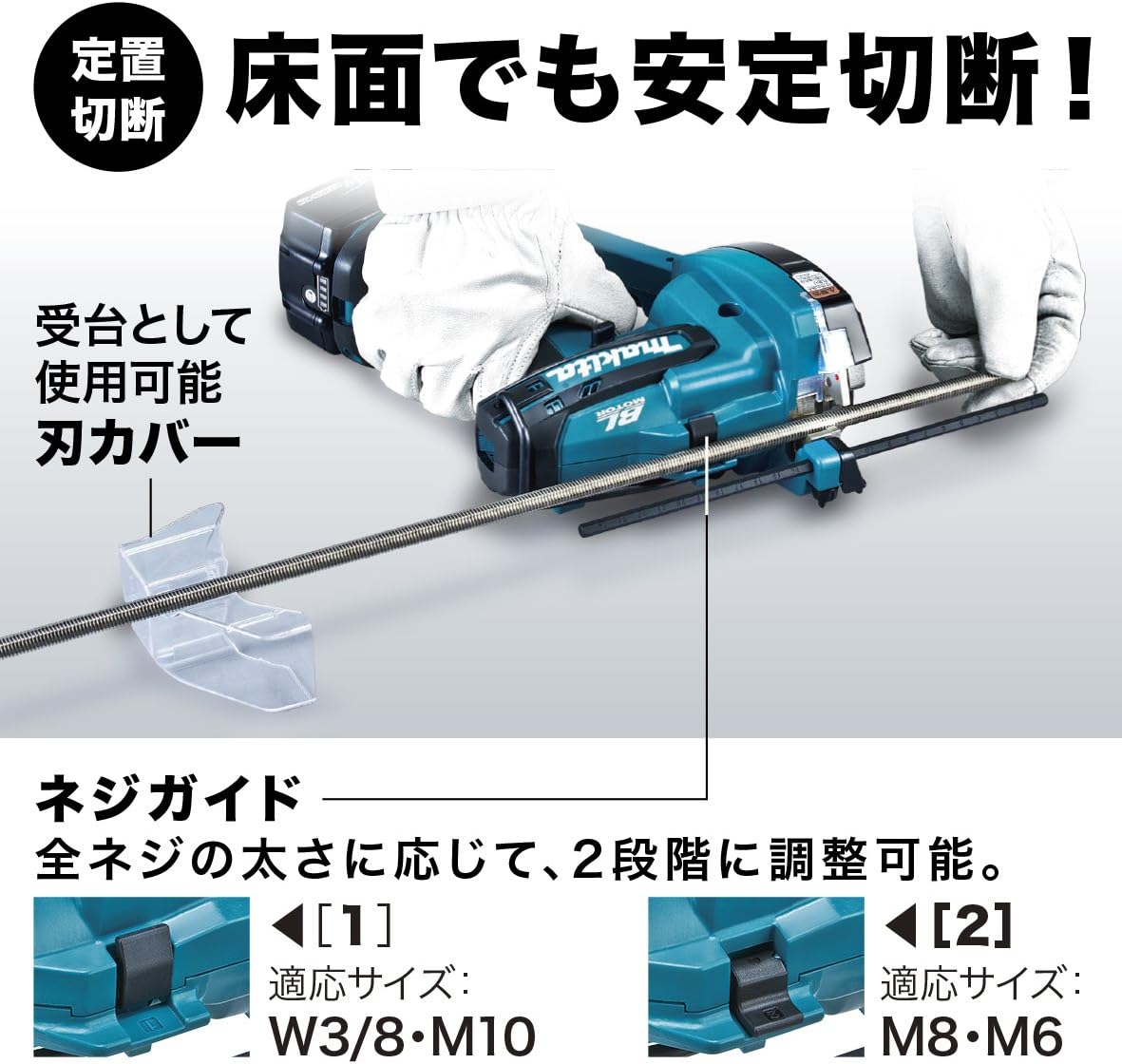 Makita(マキタ) 充電式全ネジカッタ 18V 色:ブルー | ブラック ブレード材質:金属 推奨使用場所:鉄 電源:バッテリー式(18V/14.4V スライド式Li-ion対応) 特徴:ブラシレスモータ搭載 付属品:W3/8切断用刃・スケール・六角棒スパナ・刃カバー 寸法:長さ20cm × 幅30cm × 高さ10cm 重量:約3.2kg(バッテリ含む) 商品について コンパクト&パワフル!BLモーター搭載で作業性が大幅アップ! 小型ボディに優れた重心バランスを備え、手首への負担を軽減します。 刃物取付部の剛性を見直し、従来比で刃物寿命は約2.5倍に向上。 1充電で約1,500本(W3/8 ステンレス全ネジ)の切断が可能です。 最大切断能力:W3/8全ネジ(軟鋼・ステンレス)、M10全ネジ(※純正刃必要) 質量:3.2kg