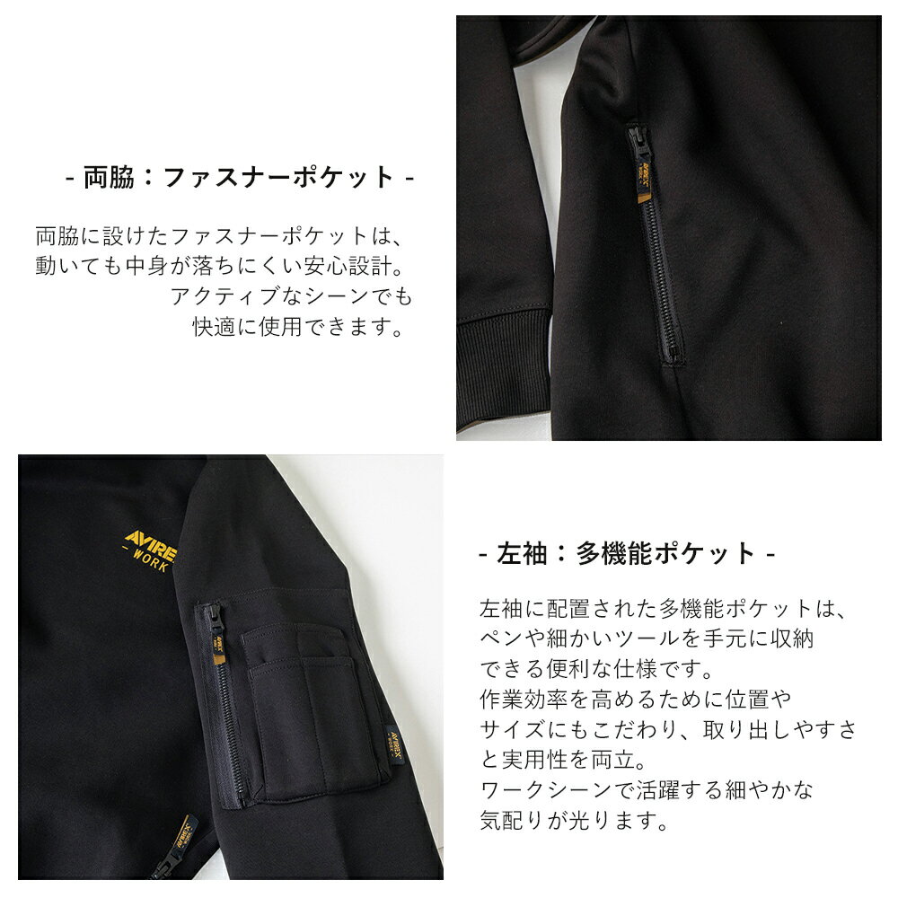 !元気に土日も出荷中!☆彡 (お支払い方法などの関係で土日に出荷できない場合もございます。) 【おすすめポイント】 ★左袖にはスマホや小物収納に便利な多機能ポケットを搭載 ★右袖に施されたAVIREXロゴワッペンが存在感を演出 ★背中裾にはロゴ入り反射プリントを配置し、夜間や暗所での視認性を向上 ★両脇にはファスナーポケットを装備し、貴重品の持ち運びも安心 ★左胸のロゴプリントがシンプルながらワークウェアらしいアクセントに 【使用イメージ・場所】 ◇秋冬の作業現場での防寒着として ◇屋外作業や夜間作業時の視認性アップに ◇タウンユースやアウトドアシーンでも着用可能なデザイン性 ◇作業服としての機能性とカジュアルウェアとしての着回し力を両立 【素材】 表地:ポリエステル68%・綿32% リブ:綿97%・ポリウレタン3%