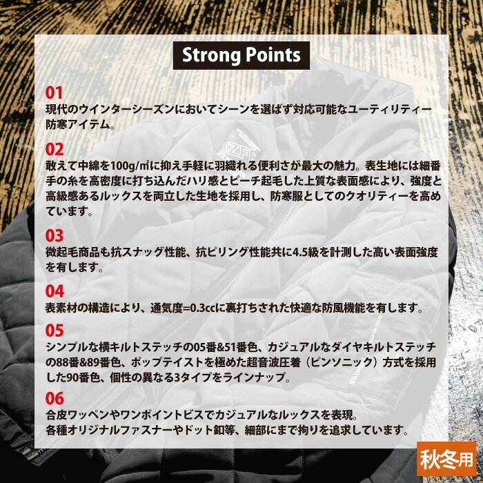 商品仕様・説明 【9050 ダウニーメモリー防寒ジャケット】 ◇メーカー:アイズフロンティア ◇秋冬用 ◇素材:ピーチ起毛ダウニーメモリー/ポリエステル100% ◇サイズ:S M L LL 3L 4L ◇色:ブラック・ヴェイパーグレー・ロンバスブラック・ロンバスグレー・ソニックブラック 【詳細】 ◇敢えて中綿を100g/m2に抑え手軽に羽織れる便利さが最大の魅力。表生地には細番手の糸を高密度に打ち込んだハリ感とピーチ起毛した上質な表面感により 強度と高級感のあるルックスを両立した生地を採用し 防寒服としてのクオリティーを高めています ◇微起毛商品も抗スナッグ性能 抗ピリング性能共に4.5級を計測した高い表面強度を有します ◇素材感の構造により 通気度=0.3ccに裏打ちされた快適な防風機能を有します ◇合皮ワッペンやポイントビスでカジュアルナルックスを表現COLOR カラー DETAIL 商品詳細 SIZE サイズ SERIES シリーズ ご利用のパソコン環境によって、実物と色合いがやや異なって見えることがあります。 同メーカーの同じ色名でも、シリーズが違うと色合いが異なる場合があります。上下でご購入の場合は、同シリーズの商品よりお選びください。 ページ内の情報はカタログ初出時のものです。予告なく商品仕様・細部名称の変更がある場合があります。 9057 ダウニーメモリー防寒ベスト 商品は全てメーカーよりお取り寄せ致します。ご注文欄の表示に関わらず、在庫欠品している場合がございます。 CUSTOMIZE カスタマイズ INFOMATION インフォメーション