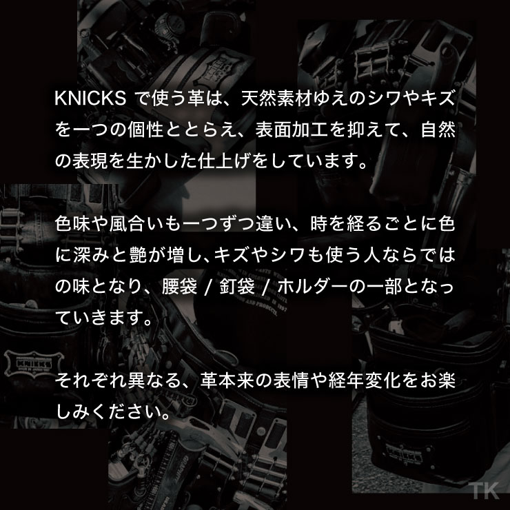 商品説明 KNICKS ニックス 鳶職向仕様ツーウェイタイプヌメ革2段腰袋 [バリスティックナイロン補強仕上げ] 商品の特長 ●縁は全てバリスティック生地巻き ●背台部ベルトループ付き/後付ベルト取付可能 カラー グリーン / 紺 / オレンジ / こげ茶 グレー / 山吹 / レッド KNICKS KNICKSで使う革は、 天然素材ゆえのシワやキズを一つの個性ととらえ、 表面加工を抑えて、 自然の表現を生かした仕上げをしています。 そのため、製品の中にもシワやキズが そのままの表情として入ります。 使い込み、時を経るごとに色に深みと艶が増し、 キズやシワも使う人ならではの味となり、 腰袋/釘袋/ホルダーの一部となっていきます。 革本来の表情や経年変化をお楽しみいただくために、 色止め等の表面加工は最小限にとどめられています。 衣服とのこすれや水濡れ等により、 他の物にも色移りしますのでご注意ください。 ※当ショップはKNICKS正規販売代理店です。 ・モニター等の環境による色の誤差や、素材により色ブレが生じる場合があります。 ・表記サイズには若干の誤差が生じる場合があります。 ・ご注文のタイミングによって、商品が欠品している可能性があります。 ・運送会社の状況・災害時・繁忙期などにより配送が遅延する可能性があります。 ・土・日・祝は休業日となっております。発送までの日数には含まれませんのでご注意ください。 KNICKSカラーカスタム KNICKSヌメ革グローブ革 KNICKSヌメ革腰袋 KNICKS腰袋KNICKS -ニックス-