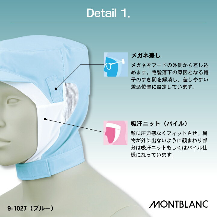 MONTBLANC - モンブラン - ショート頭巾帽子(男女兼用) 商品の特長 ショートタイプ 通音性の良い耳メッシュ仕様。 オーバーヘッドマスク対応のシンプル設計。 異物混入リスクの軽減に重要な 衛生キャップは、日々進化を遂げています。 食の安心・安全を守りつつ、 着用時のストレスを軽減することで 作業効率をアップ。 モンブランの衛生キャップは、 安全と快適を両立しています。 素材 制電トロピカル(PETボトル再生繊維) (ポリエステル100%) [吸汗ニット] (ポリエステル85%・ポリウレタン15%) カラー 9-1026 白・9-1027 ブルー 9-1028 グリーン・9-1029 ピンク サイズ M60・L62・LL64(cm) (面ファスナー調節式) ・モニター等の環境による色の誤差や、素材により色ブレが生じる場合があります。 ・表記サイズには若干の誤差が生じる場合があります。 ・ご注文のタイミングによって、商品が欠品している可能性があります。 ・運送会社の状況・災害時・繁忙期などにより配送が遅延する可能性があります。 ・土・日・祝は休業日となっております。発送までの日数には含まれませんのでご注意ください。住商モンブラン 頭巾帽子