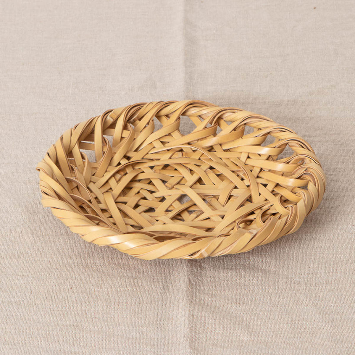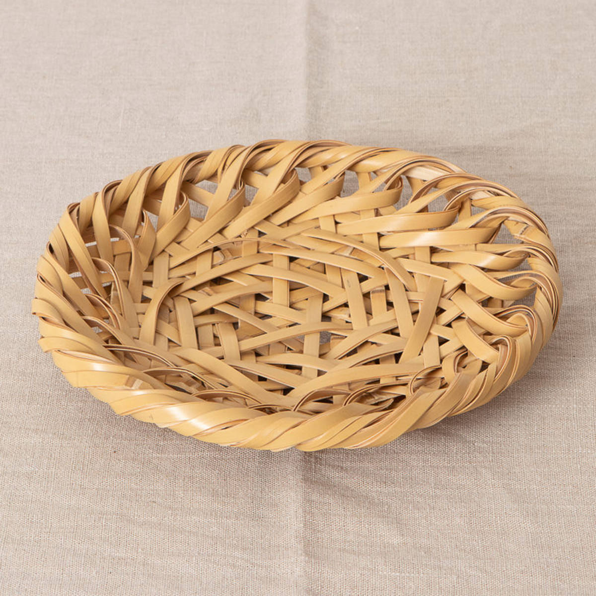 サイズ(外寸) / 重さ小サイズ:約直径23x高さ3cm/120g大サイズ:約直径25x高さ3cm/180gこちらは白竹を使って編まれたざるです。名前の通り、荒く編まれた竹皿とも言える作りです。自生している状態の青い真竹を白竹に加工する方法には、湿式と乾式の2通りがあります。こちらの白竹は湿式によるもので、竹材を釜の中に入れて煮沸処理を行い、取り出すときに竹の表面に出てきた油分を拭き取るという工程を経ます。仕上がった白竹は硬さが締まって強度が増し、光沢も出て、経年変化でさらに深い飴色を楽しむことができます。こちらのページでは、荒組の竹皿の小、大の2サイズをご紹介します。一見、不規則に編まれた乱れ編みのように見えますが、2つを見比べてみると同じ様な編み目が並び、デザインされているものだとわかります。力強い編みです。麻の葉編みをベースに竹ひごを組むように編んでいます。縁の部分です。編み上げたひごをそのまま使って縁巻きを仕上げています。上から見たところです。竹ひごのねじれが美しく、ざる全体のアクセントとなっています。厚めの竹ひごを縦二枚に剥ぎ、重ね合わせた状態で編み込んでいるため、全体的に肉厚でかっちりとした作りになっています。つやつやとした白竹の艶がきれいです。仕上げで竹の繊維を火で焼いて処理するため、こげ跡のようなものが時折見えることがあります。また、竹ひごに縦割れが入っている場合がありますが、こちらは自然なものとして見ていただければと思います。裏面です。こちらは竹の身部分がきています。テーブルに置いたときにもがたつきはなく、安定しています。お皿のようにも、ざるのようにも、オブジェのようにも思える魅力的な一品です。それでは、各サイズをご紹介します。こちらは小サイズです。お一人分の麺類を載せられるサイズです。こちらは大サイズです。1〜2人分の麺類を載せられるサイズです。小サイズに食パンを載せたところです。お皿のようにしてお使いいただけます。洋菓子、和菓子どちらにも合います。蕎麦やうどんざるとしてお使いになるのはもちろん、おにぎりやパン皿として、またはお菓子や果物を載せて使われても良さそうです。朝食のパンプレートにも。食卓やカウンターなどに置いておくだけで、その場を華やかな雰囲気にしてくれそうな、竹皿です。どちらかお好みのタイプをお選びください。<大田原の竹工芸と現代の暮らしを繋ぐ>栃木県大田原市には良質な竹があり、古くから竹工芸活動が盛んに行われてきました。この地からお二人の竹工芸家が人間国宝にも選ばれています。その竹工芸の世界で、ご自身が師匠と仰ぐお二人 −竹工芸家であるお父様と同じく竹工芸家であり人間国宝である方− から技術を教わり、大田原で長く続く竹工芸の息吹に触れ、その伝統を守りながらも新たな境地を開かれようとしている方がいらっしゃいます。もとはデザイン設計の仕事をされていて、中東とヨーロッパをバックパッカーとして回った経験もお持ちのこのお方。作りだされる作品は、伝統の技法を踏襲しつつも、どこか新鮮で、今までご本人が培われてきたバッググラウンドが投影されているように感じられます。日々の暮らしを豊かにしてくれる、実用的でいて、落ち着きのある、上質な作品を作られています。