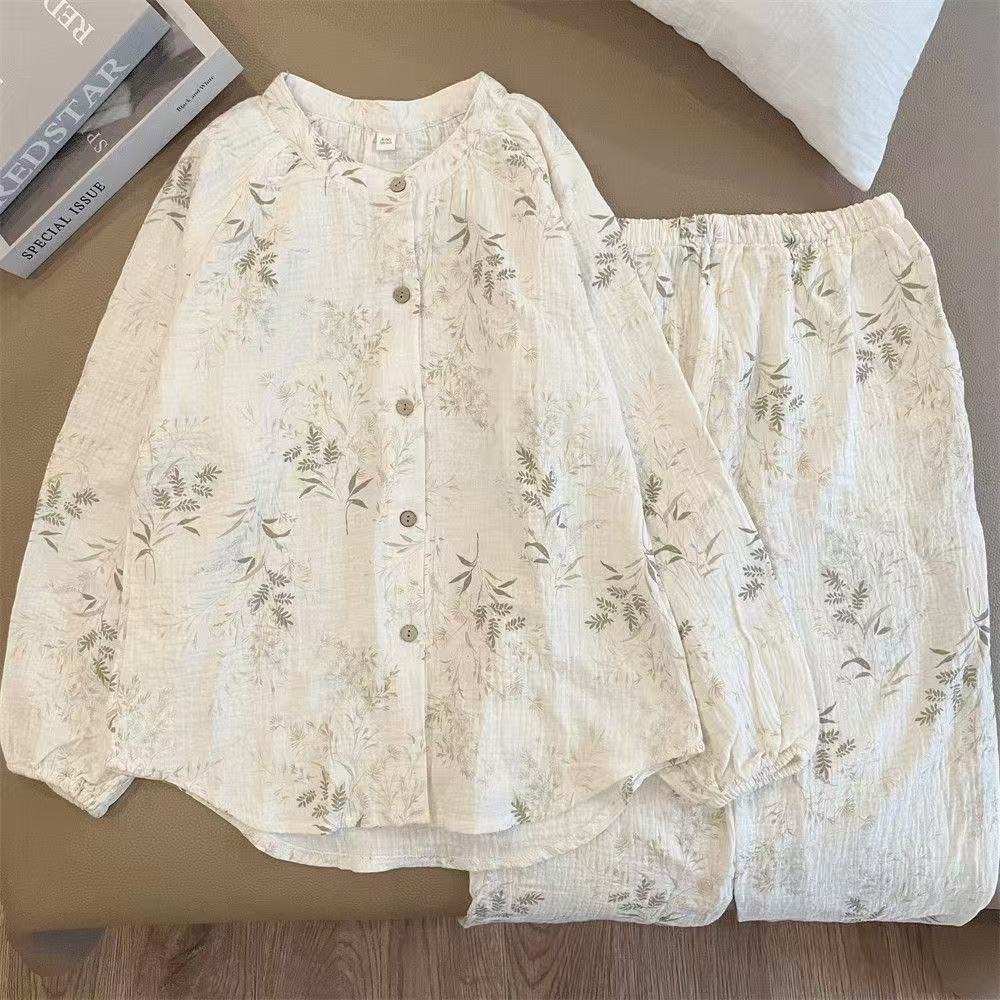 パジャマ ルームウェア レディース ガーゼパジャマ 花柄 春 長袖パジャマ 2層ガーゼ トップス+パンツ 2点セット レディースパジャマ 薄い 可愛い ロングパンツ 薄手パジャマ ルームウェア上下セット 女性 部屋着 寝巻き 大人 オシャレ SLPD001(M-2XL)